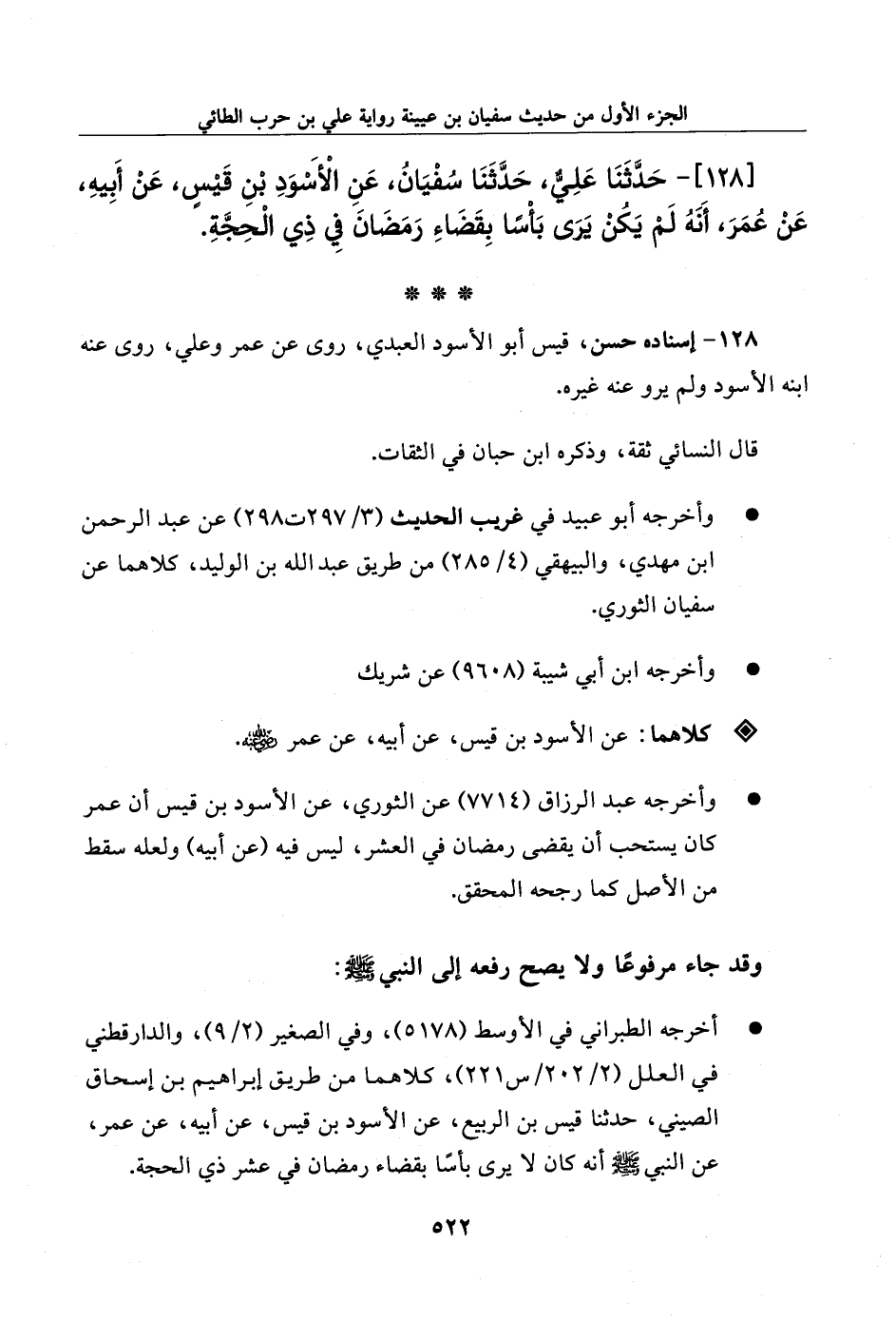 128 - حدثنا علي، حدثنا سفيان، عن الأسود بن قيس، عن أبيه، عن عمر، أنه لم يكن يرى بأسا بقضاء رمضان في ذي الحجة.