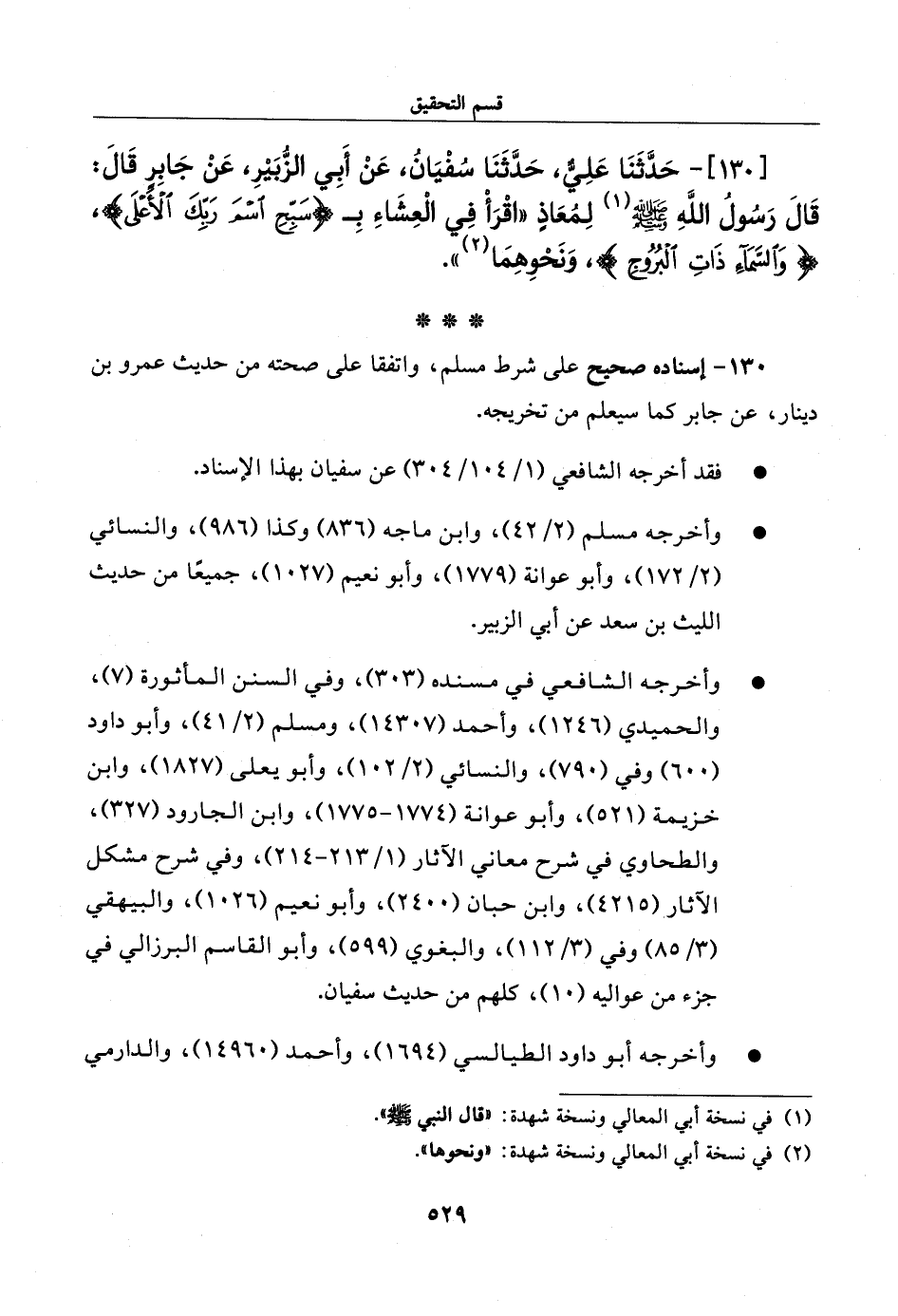 130 - حدثنا علي، حدثنا سفيان، عن أبي الزبير، عن جابر قال: قال رسول الله صلى الله عليه وسلم لمعاذ ((اقرأ في العشاء بـ {سبح اسم ربك الأعلى}، {والسماء ذات البروج}، ونحوهما)).