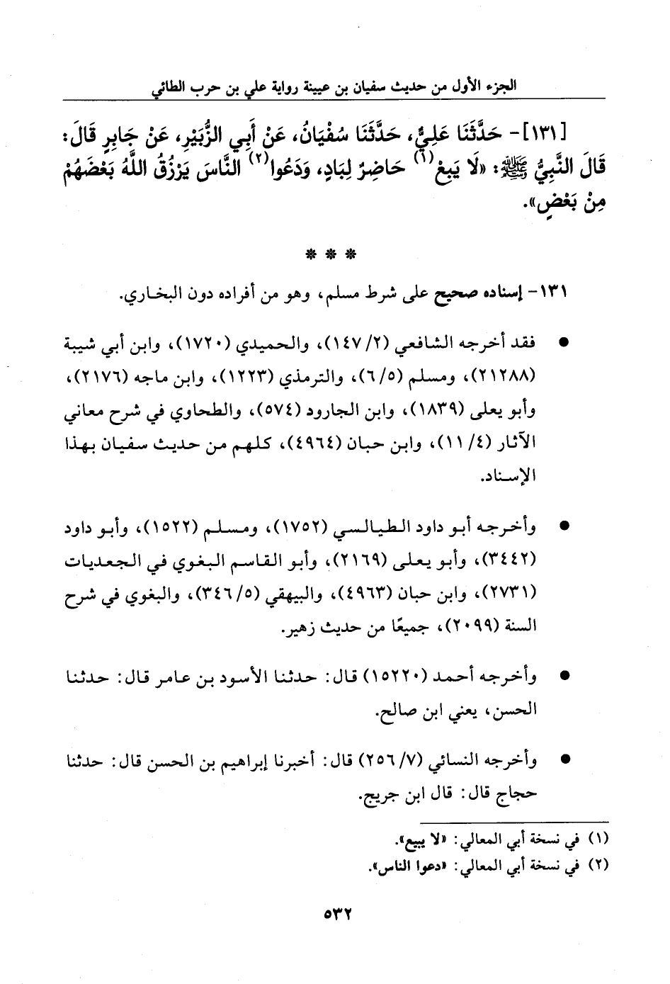131 - حدثنا علي، حدثنا سفيان، عن أبي الزبير، عن جابر قال: قال النبي صلى الله عليه وسلم: ((لا يبع حاضر لباد، ودعوا الناس يرزق الله بعضهم من بعض)).