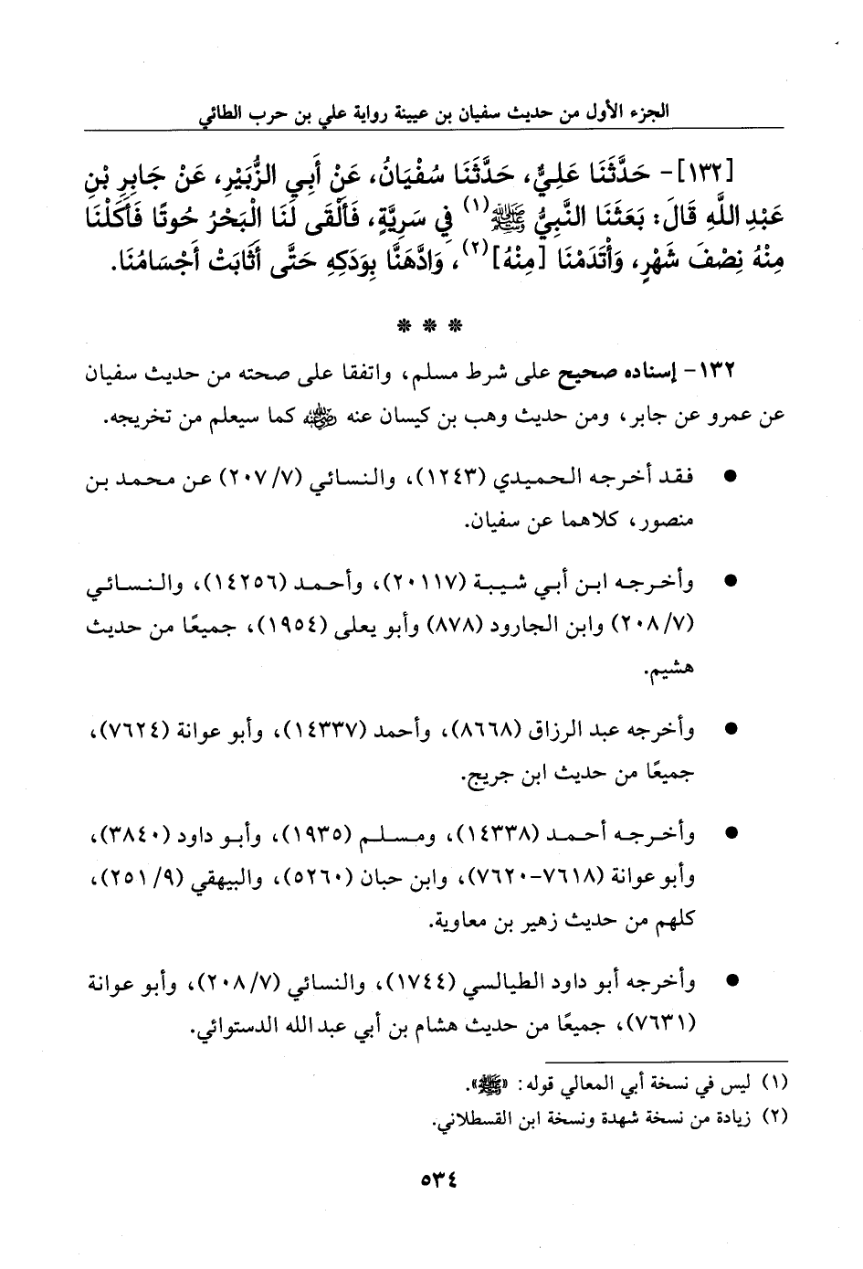 132 - حدثنا علي، حدثنا سفيان، عن أبي الزبير، عن جابر بن عبد الله قال: بعثنا النبي صلى الله عليه وسلم في سرية، فألقى لنا البحر حوتا فأكلنا منه نصف شهر، وأتدمنا [منه]، وادهنا بودكه حتى أثابت أجسامنا.