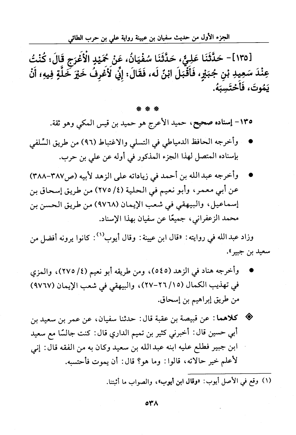 135 - حدثنا علي، حدثنا سفيان، عن حميد الأعرج قال: كنت عند سعيد بن جبير، فأقبل ابن له، فقال: إني لأعرف خير خلة فيه؛ أن يموت، فأحتسبه.