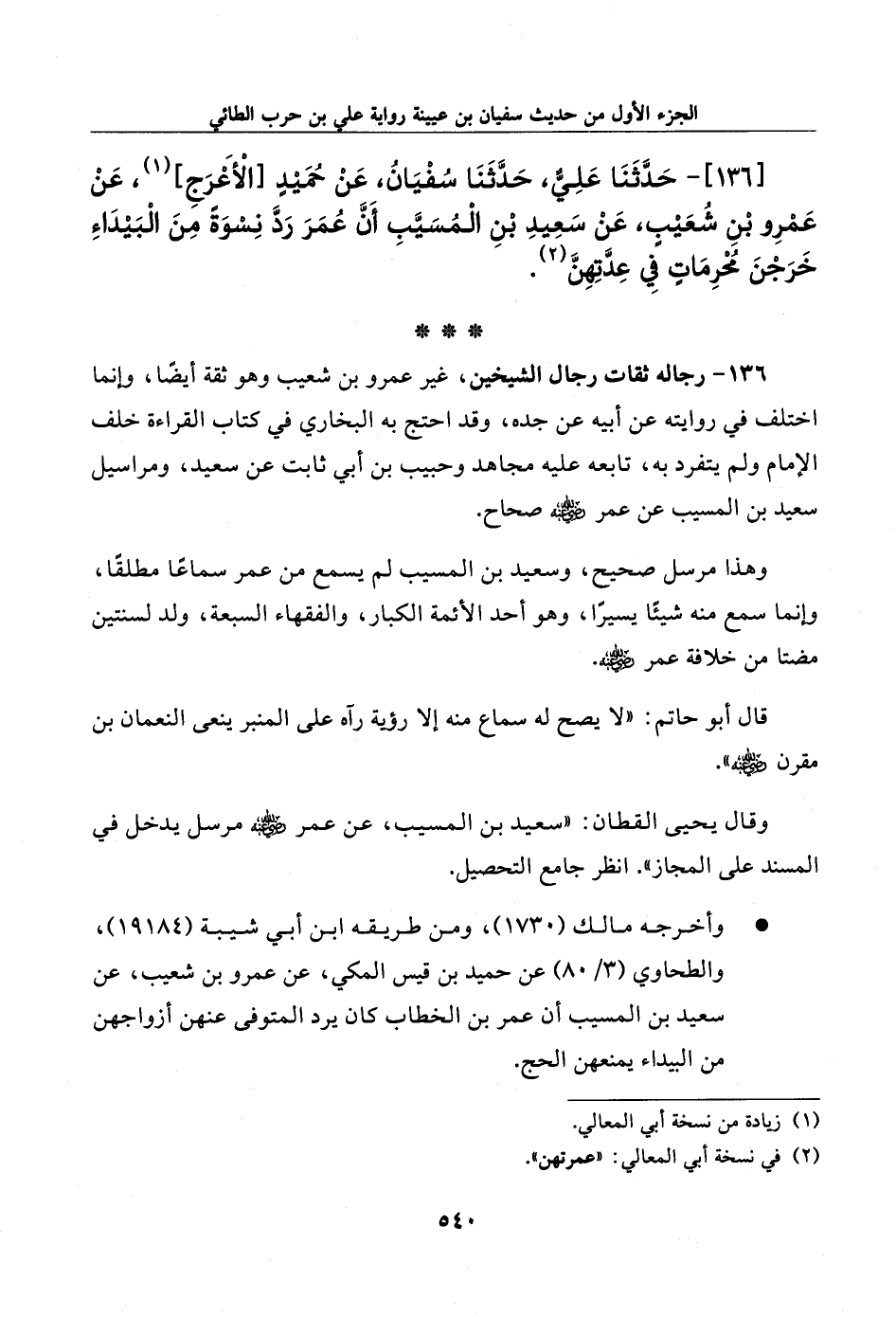 136 - حدثنا علي، حدثنا سفيان، عن حميد [الأعرج]، عن عمرو بن شعيب، عن سعيد بن المسيب أن عمر رد نسوة من البيداء خرجن محرمات في عدتهن.
