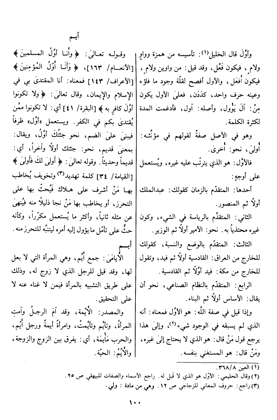 وإذا قيل في صفة الله: هو الأوّل فمعناه: أنه الذي لم يسبقه في الوجود شيء «2» ، وإلى هذا يرجع قول من قال: هو الذي لا يحتاج إلى غيره، ومن قال: هو المستغني بنفسه. وقوله تعالى: وَأَنَا أَوَّلُ الْمُسْلِمِينَ [الأنعام/ 163] ، وَأَنَا أَوَّلُ الْمُؤْمِنِينَ [الأعراف/ 143] فمعناه: أنا المقتدى بي في الإسلام والإيمان، وقال تعالى: وَلا تَكُونُوا أَوَّلَ كافِرٍ بِهِ [البقرة/ 41] أي: لا تكونوا ممّن يقتدى بكم في الكفر. ويستعمل «أوّل» ظرفا فيبنى على الضم، نحو جئتك أوّل، ويقال: