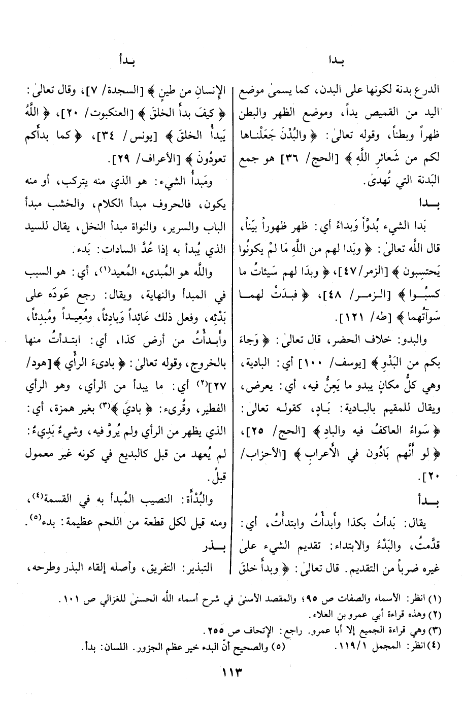 ومَبْدَأُ الشيء: هو الذي منه يتركب، أو منه يكون، فالحروف مبدأ الكلام، والخشب مبدأ الباب والسرير، والنواة مبدأ النخل، يقال للسيد الذي يبدأ به إذا عدّ السادات: بَدْءٌ.