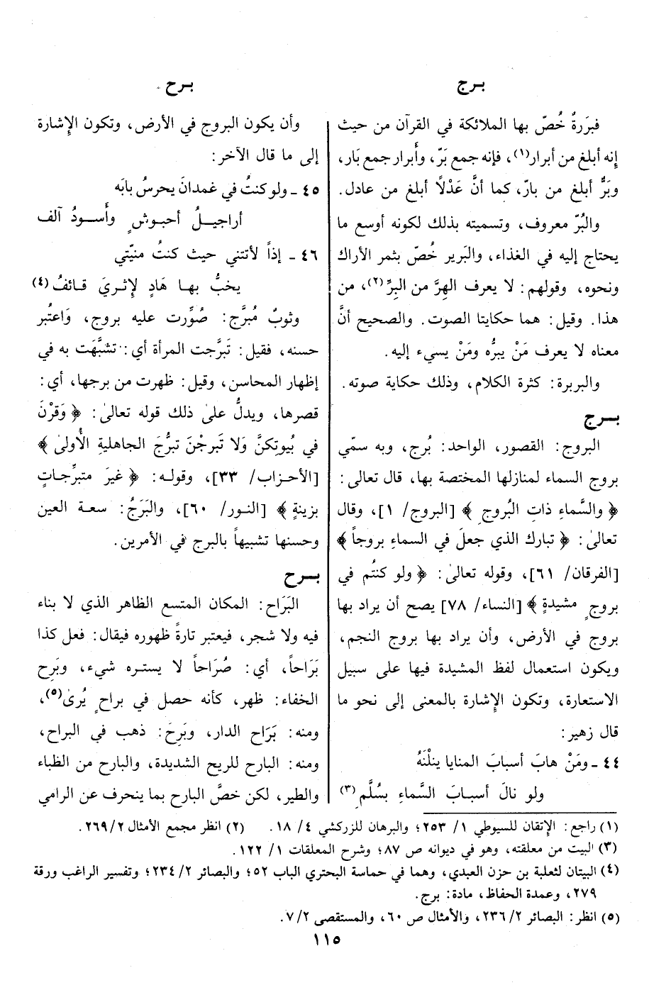 «4» وثوب مُبَرَّج: صوّرت عليه بروج، واعتبر حسنه، فقيل: تَبَرَّجَتِ المرأة أي: تشبّهت به في إظهار المحاسن، وقيل: ظهرت من برجها، أي: