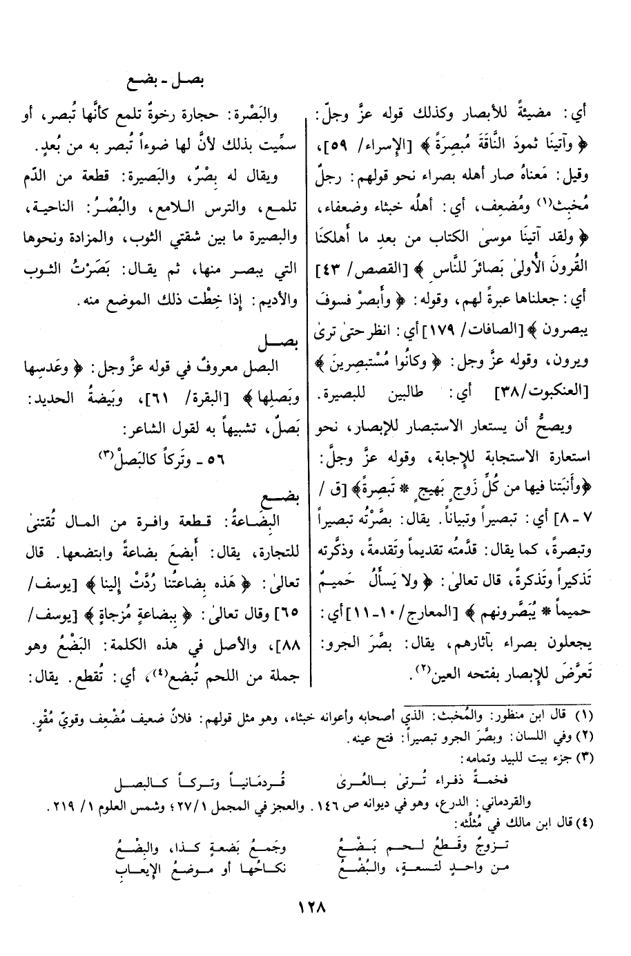 تعرّض للإبصار لفتحه العين «2» . والبَصْرَة: حجارة رخوة تلمع كأنّها تبصر، أو سمّيت بذلك لأنّ لها ضوءا تبصر به من بعد.