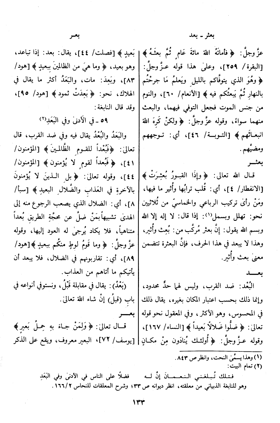 [النساء/ 167] ، وقوله عزّ وجلّ: أُولئِكَ يُنادَوْنَ مِنْ مَكانٍ بَعِيدٍ [فصلت/ 44] ، يقال: بعد: إذا تباعد، وهو بعيد، وَما هِيَ مِنَ الظَّالِمِينَ بِبَعِيدٍ [هود/ 83] ، وبَعِدَ: مات، والبعد أكثر ما يقال في الهلاك، نحو: بَعِدَتْ ثَمُودُ