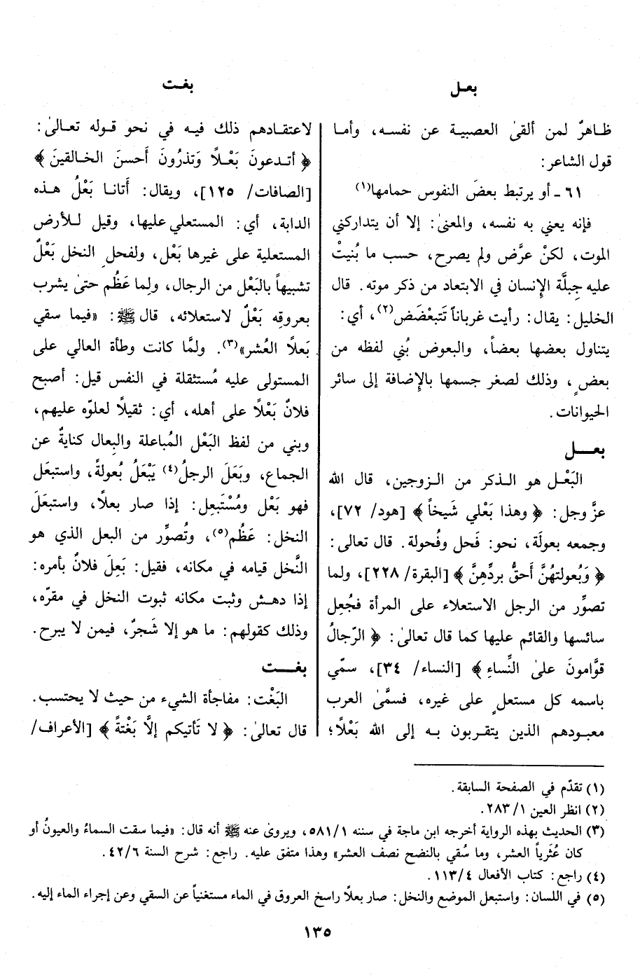 أَتَدْعُونَ بَعْلًا وَتَذَرُونَ أَحْسَنَ الْخالِقِينَ [الصافات/ 125] ، ويقال: أتانا بَعْلُ هذه الدابة، أي: المستعلي عليها، وقيل للأرض المستعلية على غيرها بَعْلٌ، ولفحل النخل بَعْلٌ تشبيها بالبعل من الرجال، ولما عظم حتى يشرب بعروقه بعل لاستعلائه، قال صلّى الله عليه وسلم: «فيما سقي بعلا العشر» «3» . ولمّا كانت وطأة العالي على المستولى عليه مستثقلة في النفس قيل: أصبح فلان بَعْلًا على أهله، أي: ثقيلا لعلوّه عليهم، وبني من لفظ البعل المُبَاعَلَة والبِعَال كناية عن الجماع، وبَعَلَ الرجل «4» يَبْعَلُ بُعُولَةً، واسْتَبْعَلَ فهو بَعْلٌ ومُسْتَبْعِلٌ: إذا صار بعلا، واستبعل النخل: عظم «5» ، وتصوّر من البعل الذي هو النّخل قيامه في مكانه، فقيل: بَعِلَ فلانٌ بأمره: