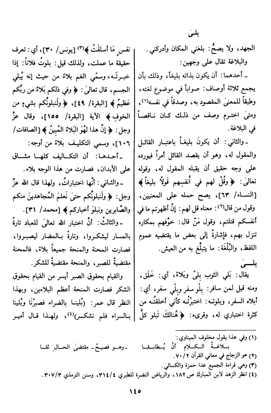 - والثاني: أن يكون بليغا باعتبار القائل والمقول له، وهو أن يقصد القائل أمرا فيورده على وجه حقيق أن يقبله المقول له، وقوله تعالى: وَقُلْ لَهُمْ فِي أَنْفُسِهِمْ قَوْلًا بَلِيغاً [النساء/ 63] ، يصح حمله على المعنيين، وقول من قال «2» : معناه قل لهم: إن أظهرتم ما في أنفسكم قتلتم، وقول من قال: خوّفهم بمكاره تنزل بهم، فإشارة إلى بعض ما يقتضيه عموم اللفظ، والبلغة: ما يتبلّغ به من العيش.