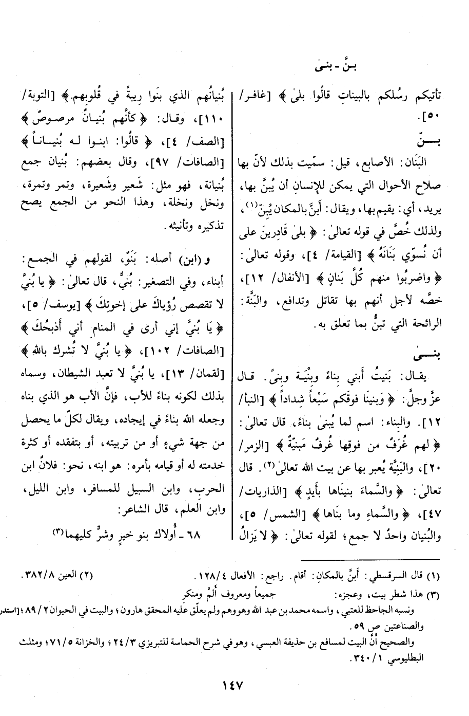 أَبْنَاء، وفي التصغير: بُنَيّ، قال تعالى: يا بُنَيَّ لا تَقْصُصْ رُؤْياكَ عَلى إِخْوَتِكَ [يوسف/ 5] ، يا بُنَيَّ إِنِّي أَرى فِي الْمَنامِ أَنِّي أَذْبَحُكَ [الصافات/ 102] ، يا بُنَيَّ لا تُشْرِكْ بِاللَّهِ [لقمان/ 13] ، يا بنيّ لا تعبد الشيطان، وسماه بذلك لكونه بناء للأب، فإنّ الأب هو الذي بناه وجعله الله بناء في إيجاده، ويقال لكلّ ما يحصل من جهة شيء أو من تربيته، أو بتفقده أو كثرة خدمته له أو قيامه بأمره: هو ابنه، نحو: فلان ابن الحرب، وابن السبيل للمسافر، وابن الليل، وابن العلم، قال الشاعر: