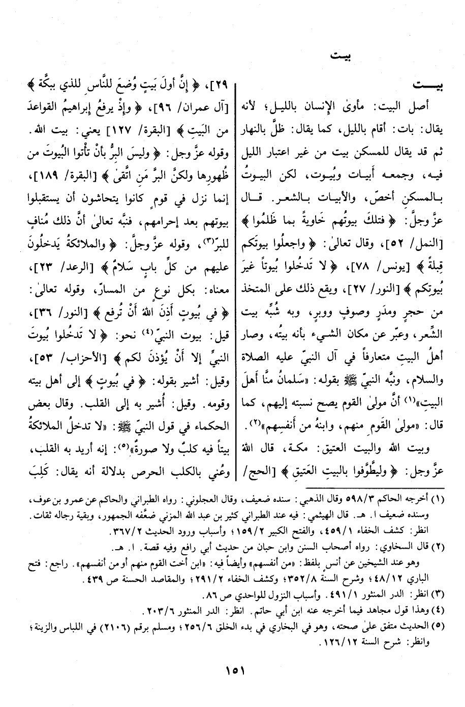 أصل البيت: مأوى الإنسان بالليل، لأنه يقال: بَاتَ: أقام بالليل، كما يقال: ظلّ بالنهار ثم قد يقال للمسكن بيت من غير اعتبار الليل فيه، وجمعه أَبْيَات وبُيُوت، لكن البيوت بالمسكن أخصّ، والأبيات بالشعر. قال عزّ وجلّ: فَتِلْكَ بُيُوتُهُمْ خاوِيَةً بِما ظَلَمُوا [النمل/ 52] ، وقال تعالى: وَاجْعَلُوا بُيُوتَكُمْ قِبْلَةً [يونس/ 78] ، لا تَدْخُلُوا بُيُوتاً غَيْرَ بُيُوتِكُمْ [النور/ 27] ، ويقع ذلك على المتخذ من حجر ومدر وصوف ووبر، وبه شبّه بيت الشعر، وعبّر عن مكان الشيء بأنه بيته، وصار أهلُ البيتِ متعارفا في آل النبيّ عليه الصلاة والسلام، ونبّه النبيّ صلّى الله عليه وسلم بقوله: «سلمان منّا أهل البيت» «1» أنّ مولى القوم يصح نسبته إليهم، كما قال: «مولى القوم منهم، وابنه من أنفسهم» «2» .
