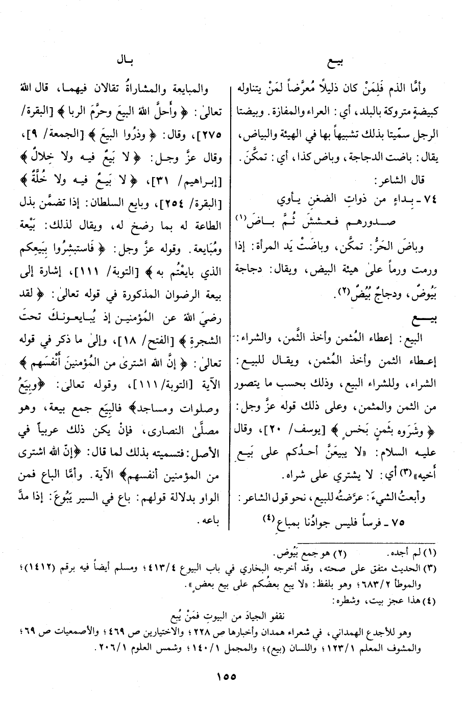 «4» والمُبَايَعَة والمشارة تقالان فيهما، قال الله تعالى: وَأَحَلَّ اللَّهُ الْبَيْعَ وَحَرَّمَ الرِّبا [البقرة/ 275] ، وقال: وَذَرُوا الْبَيْعَ [الجمعة/ 9] ، وقال عزّ وجل: لا بَيْعٌ فِيهِ وَلا خِلالٌ [إبراهيم/ 31] ، لا بَيْعٌ فِيهِ وَلا خُلَّةٌ [البقرة/ 254] ، وبَايَعَ السلطان: إذا تضمّن بذل الطاعة له بما رضخ له، ويقال لذلك: بَيْعَة ومُبَايَعَة. وقوله عزّ وجل: فَاسْتَبْشِرُوا بِبَيْعِكُمُ الَّذِي بايَعْتُمْ بِهِ [التوبة/ 111] ، إشارة إلى بيعة الرضوان المذكورة في قوله تعالى: لَقَدْ رَضِيَ اللَّهُ عَنِ الْمُؤْمِنِينَ إِذْ يُبايِعُونَكَ تَحْتَ الشَّجَرَةِ [الفتح/ 18] ، وإلى ما ذكر في قوله تعالى: إِنَّ اللَّهَ اشْتَرى مِنَ الْمُؤْمِنِينَ أَنْفُسَهُمْ الآية [التوبة/ 111] ، وأمّا الباع فمن الواو بدلالة قولهم: باع في السير يبوع: إذا مدّ باعه.
