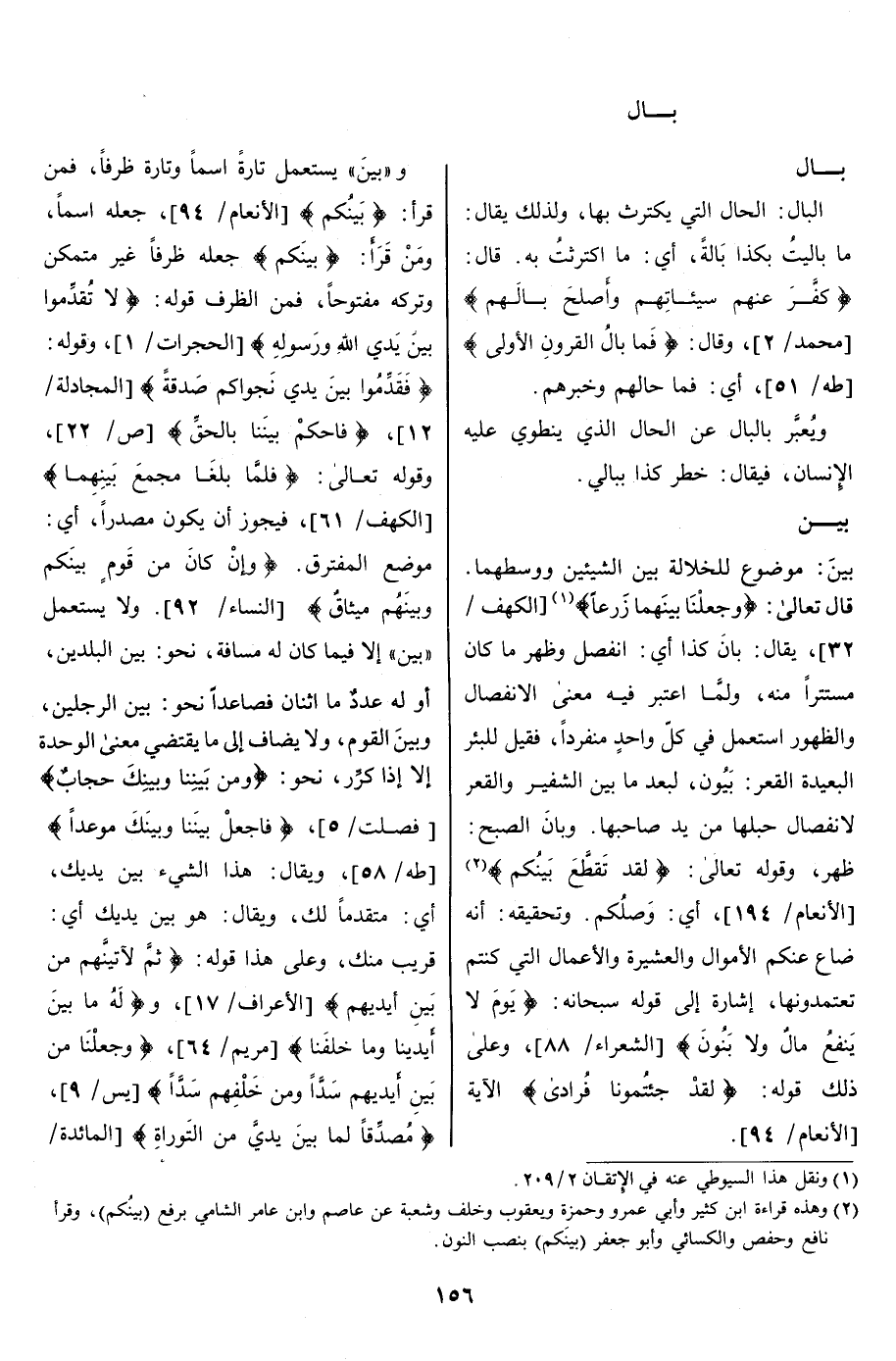 و «بَيْن» يستعمل تارة اسما وتارة ظرفا، فمن قرأ: بينكم [الأنعام/ 94] ، جعله اسما، ومن قرأ: بَيْنَكُمْ جعله ظرفا غير متمكن وتركه مفتوحا، فمن الظرف قوله: لا تُقَدِّمُوا بَيْنَ يَدَيِ اللَّهِ وَرَسُولِهِ [الحجرات/ 1] ، وقوله: فَقَدِّمُوا بَيْنَ يَدَيْ نَجْواكُمْ صَدَقَةً [المجادلة/ 12] ، فَاحْكُمْ بَيْنَنا بِالْحَقِّ [ص/ 22] ، وقوله تعالى: فَلَمَّا بَلَغا مَجْمَعَ بَيْنِهِما [الكهف/ 61] ، فيجوز أن يكون مصدرا، أي: