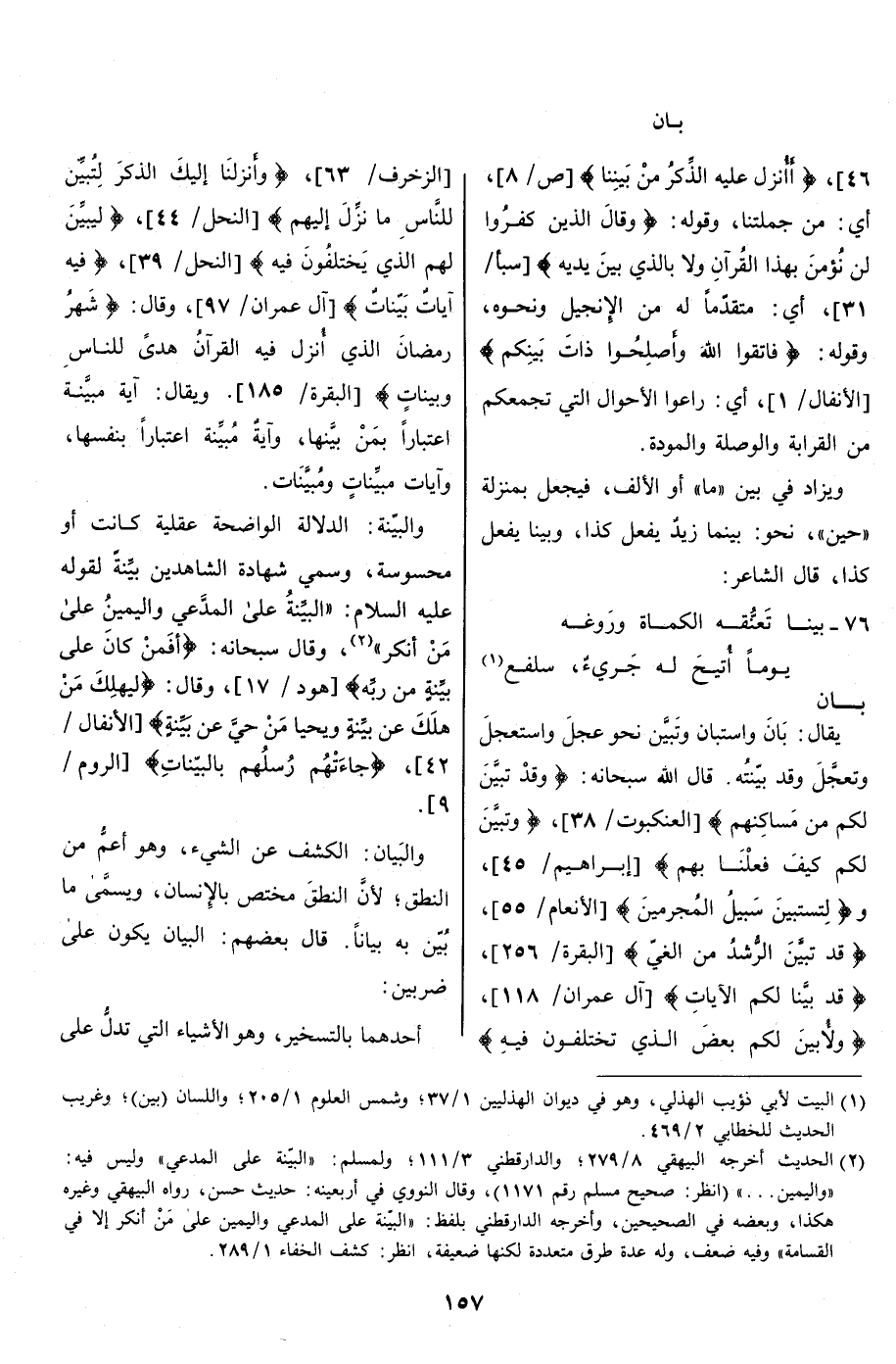 يقال: بَانَ واسْتَبَانَ وتَبَيَّنَ نحو عجل واستعجل وتعجّل وقد بَيَّنْتُهُ. قال الله سبحانه: وَقَدْ تَبَيَّنَ لَكُمْ مِنْ مَساكِنِهِمْ [العنكبوت/ 38] ، وَتَبَيَّنَ لَكُمْ كَيْفَ فَعَلْنا بِهِمْ [إبراهيم/ 45] ، ولِتَسْتَبِينَ سَبِيلُ الْمُجْرِمِينَ [الأنعام/ 55] ، قَدْ تَبَيَّنَ الرُّشْدُ مِنَ الْغَيِّ [البقرة/ 256] ، قَدْ بَيَّنَّا لَكُمُ الْآياتِ [آل عمران/ 118] ، وَلِأُبَيِّنَ لَكُمْ بَعْضَ الَّذِي تَخْتَلِفُونَ فِيهِ [الزخرف/ 63] ، وَأَنْزَلْنا إِلَيْكَ الذِّكْرَ لِتُبَيِّنَ لِلنَّاسِ ما نُزِّلَ إِلَيْهِمْ [النحل/ 44] ، لِيُبَيِّنَ لَهُمُ الَّذِي يَخْتَلِفُونَ فِيهِ [النحل/ 39] ، فِيهِ آياتٌ بَيِّناتٌ [آل عمران/ 97] ، وقال: شَهْرُ رَمَضانَ الَّذِي أُنْزِلَ فِيهِ الْقُرْآنُ هُدىً لِلنَّاسِ وَبَيِّناتٍ [البقرة/ 185] . ويقال: آية مُبَيَّنَة اعتبارا بمن بيّنها، وآية مُبَيِّنَة اعتبارا بنفسها، وآيات مبيّنات ومبيّنات.