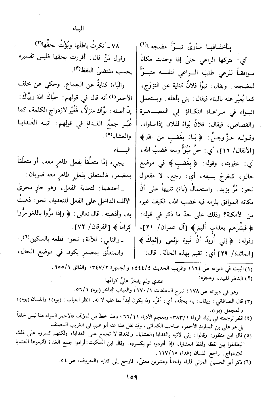 «1» وقول من قال: أقررت بحقها فليس تفسيره بحسب مقتضى اللفظ «2» . والبَاءَة كناية عن الجماع. وحكي عن خلف الأحمر «3» أنه قال في قولهم: حيّاك الله وبيّاك: