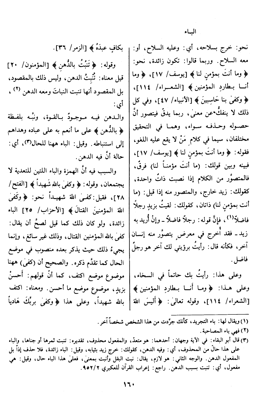 وَما أَنَا بِطارِدِ الْمُؤْمِنِينَ [الشعراء/ 114] ، وَكَفى بِنا حاسِبِينَ [الأنبياء/ 47] ، وفي كل ذلك لا ينفكّ عن معنى، ربما يدقّ فيتصور أنّ حصوله وحذفه سواء، وهما في التحقيق مختلفان، سيما في كلام من لا يقع عليه اللغو، فقوله: وَما أَنْتَ بِمُؤْمِنٍ لَنا [يوسف/ 17] ، فبينه وبين قولك: (ما أنت مؤمنا لنا) فرق، فالمتصوّر من الكلام إذا نصبت ذات واحدة، كقولك: زيد خارج، والمتصور منه إذا قيل: (ما أنت بمؤمن لنا) ذاتان، كقولك: لقيت بزيد رجلا فاضلا، فإنّ قوله: رجلا فاضلا- وإن أريد به زيد- فقد أخرج في معرض يتصوّر منه إنسان آخر، فكأنه قال: رأيت برؤيتي لك آخر هو رجل فاضل.