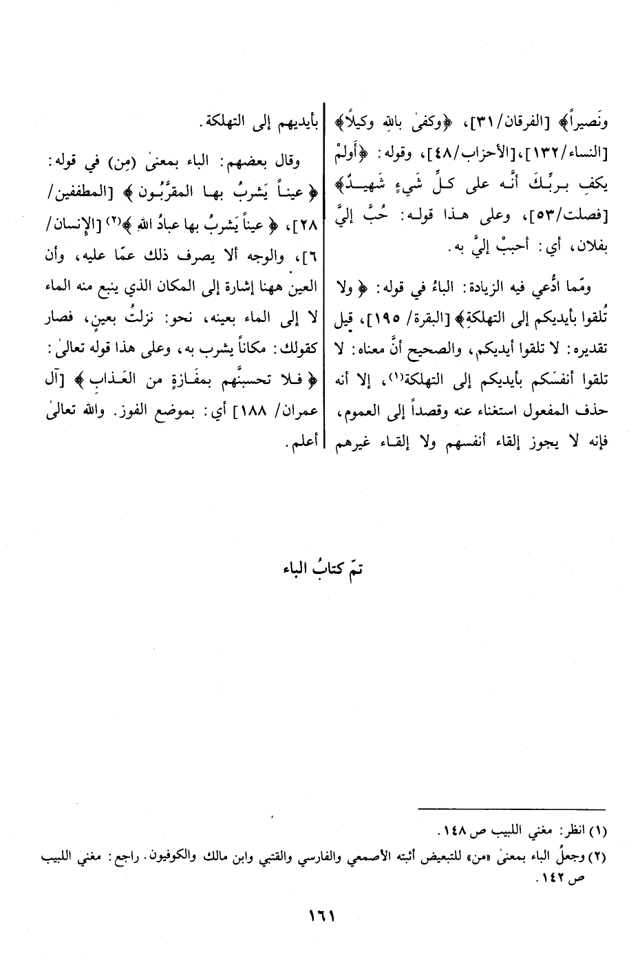 (2) وجعل الباء بمعنى «من» للتبعيض أثبته الأصمعي والفارسي والقتبي وابن مالك والكوفيون. راجع: مغني اللبيب ص 142.
