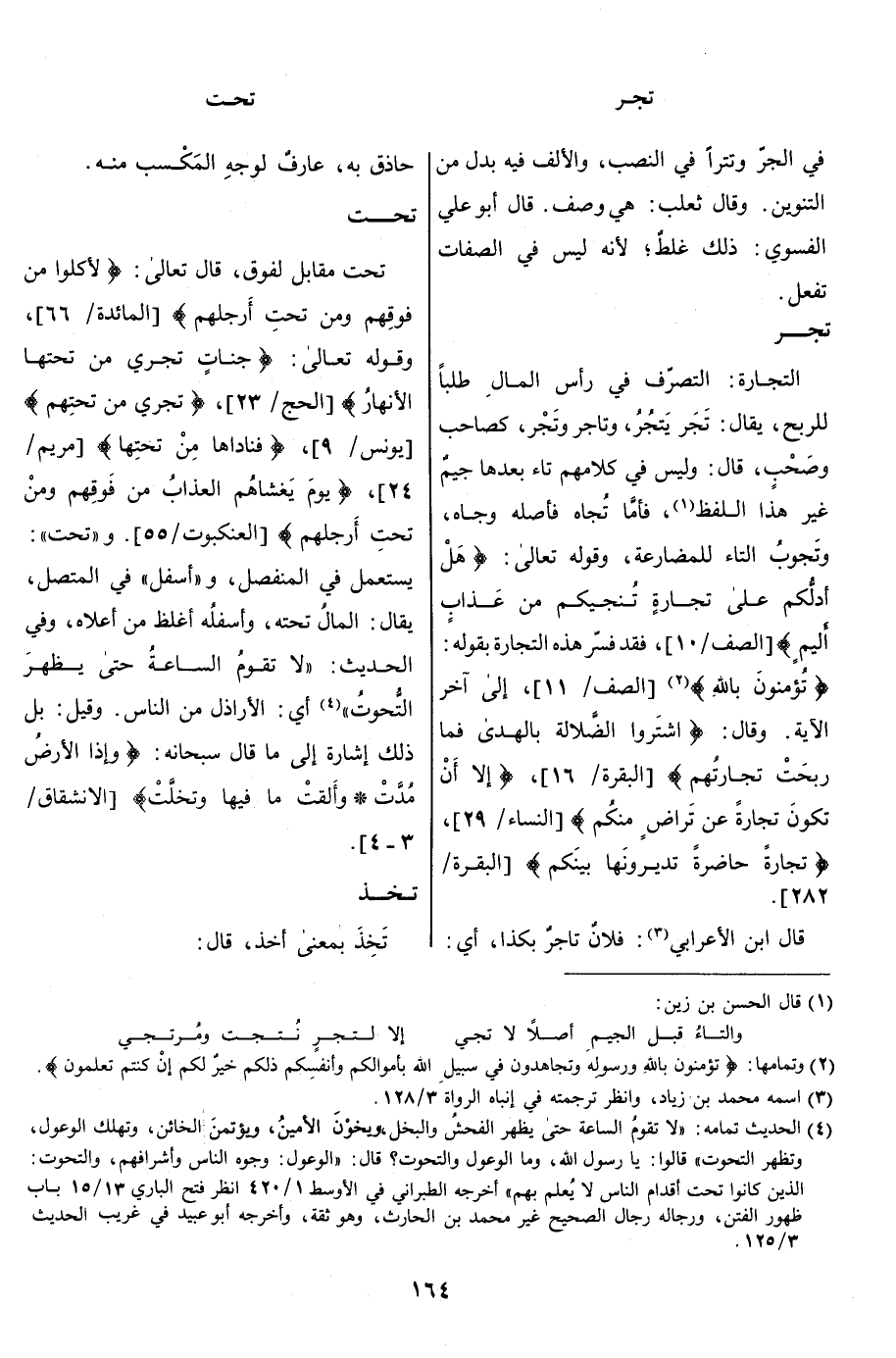 تَحْت مقابل لفوق، قال تعالى: لَأَكَلُوا مِنْ فَوْقِهِمْ وَمِنْ تَحْتِ أَرْجُلِهِمْ [المائدة/ 66] ، وقوله تعالى: جَنَّاتٍ تَجْرِي مِنْ تَحْتِهَا الْأَنْهارُ [الحج/ 23] ، تَجْرِي مِنْ تَحْتِهِمْ [يونس/ 9] ، فَناداها مِنْ تَحْتِها [مريم/ 24] ، يَوْمَ يَغْشاهُمُ الْعَذابُ مِنْ فَوْقِهِمْ وَمِنْ تَحْتِ أَرْجُلِهِمْ [العنكبوت/ 55] . و «تحت» :