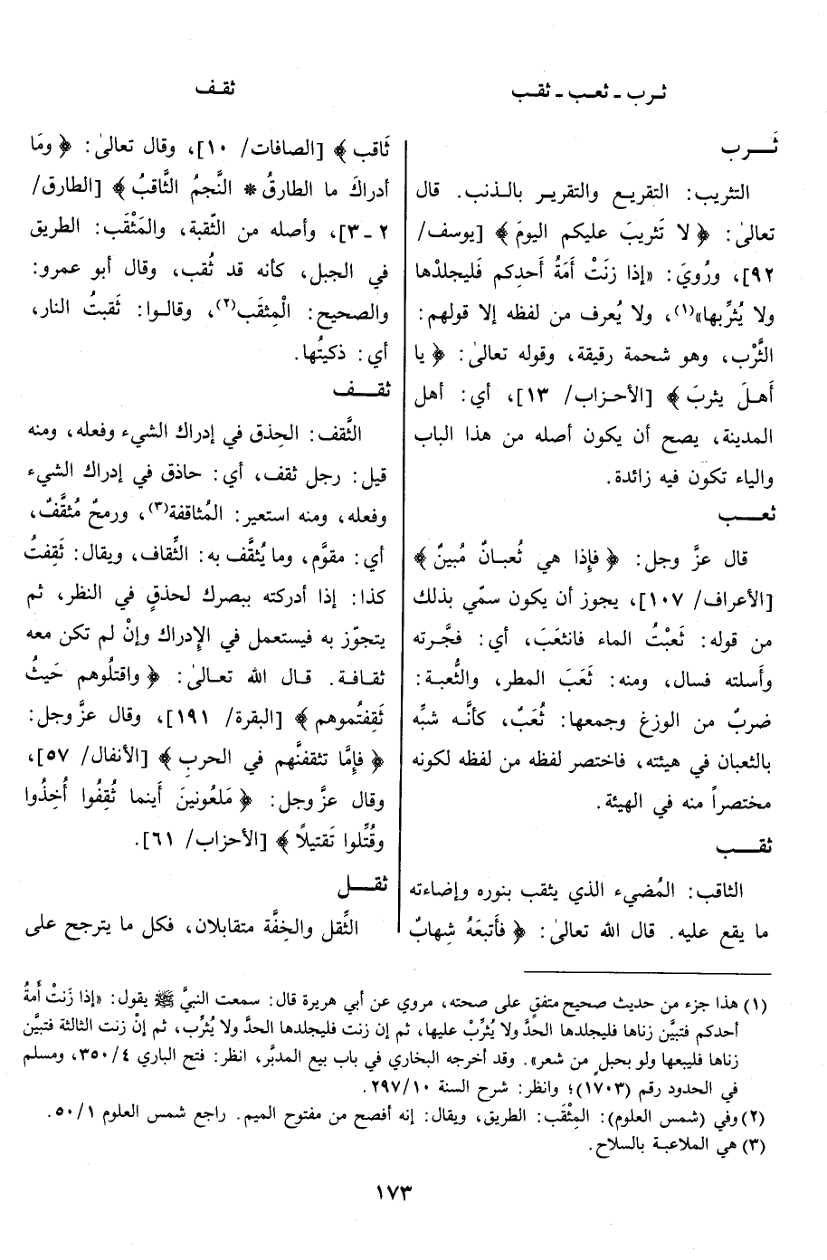 الثَّقْفُ: الحذق في إدراك الشيء وفعله، ومنه قيل: رجل ثَقِفٌ، أي: حاذق في إدراك الشيء وفعله، ومنه استعير: المُثَاقَفَة «3» ، ورمح مُثَقَّف، أي: مقوّم، وما يُثَقَّفُ به: الثِّقَاف، ويقال: ثَقِفْتُ كذا: إذا أدركته ببصرك لحذق في النظر، ثم يتجوّز به فيستعمل في الإدراك وإن لم تكن معه ثِقَافَة. قال الله تعالى: وَاقْتُلُوهُمْ حَيْثُ ثَقِفْتُمُوهُمْ [البقرة/ 191] ، وقال عزّ وجل: