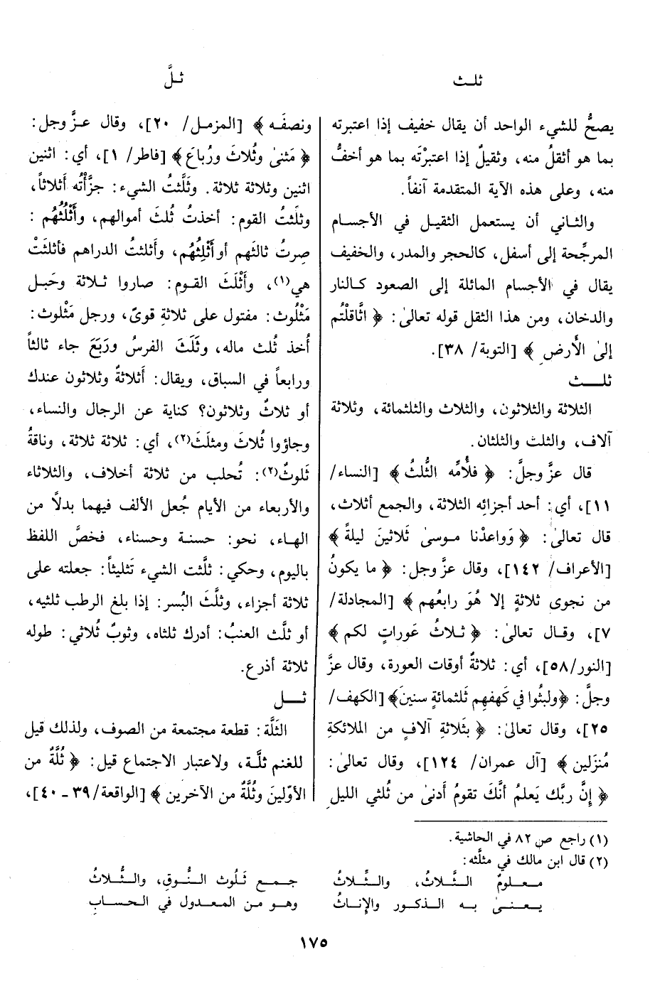 قال عزّ وجلّ: فَلِأُمِّهِ الثُّلُثُ [النساء/ 11] ، أي: أحد أجزائه الثلاثة، والجمع أَثْلَاث، قال تعالى: وَواعَدْنا مُوسى ثَلاثِينَ لَيْلَةً [الأعراف/ 142] ، وقال عزّ وجل: ما يَكُونُ مِنْ نَجْوى ثَلاثَةٍ إِلَّا هُوَ رابِعُهُمْ [المجادلة/ 7] ، وقال تعالى: ثَلاثُ عَوْراتٍ لَكُمْ [النور/ 58] ، أي: ثلاثة أوقات العورة، وقال عزّ وجلّ: وَلَبِثُوا فِي كَهْفِهِمْ ثَلاثَ مِائَةٍ سِنِينَ [الكهف/ 25] ، وقال تعالى: بِثَلاثَةِ آلافٍ مِنَ الْمَلائِكَةِ مُنْزَلِينَ [آل عمران/ 124] ، وقال تعالى: