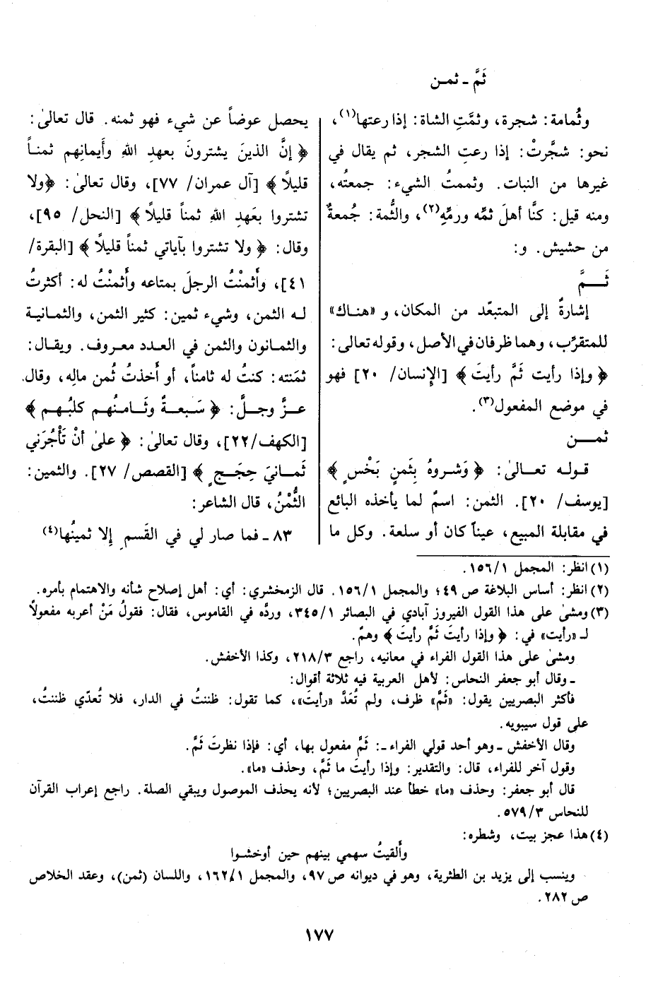 إِنَّ الَّذِينَ يَشْتَرُونَ بِعَهْدِ اللَّهِ وَأَيْمانِهِمْ ثَمَناً قَلِيلًا [آل عمران/ 77] ، وقال تعالى: وَلا تَشْتَرُوا بِعَهْدِ اللَّهِ ثَمَناً قَلِيلًا [النحل/ 95] ، وقال: وَلا تَشْتَرُوا بِآياتِي ثَمَناً قَلِيلًا [البقرة/ 41] ، وأَثْمَنْتُ الرَّجُلَ بمتاعه وأَثْمَنْتُ لَهُ: أكثرت له الثمن، وشيء ثَمِين: كثير الثمن، والثَّمَانِيَة والثَّمَانُون والثُّمُن في العدد معروف. ويقال: