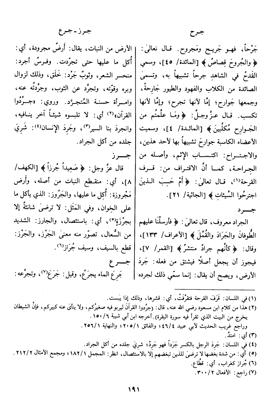 الجَرَاد معروف، قال تعالى: فَأَرْسَلْنا عَلَيْهِمُ الطُّوفانَ وَالْجَرادَ وَالْقُمَّلَ [الأعراف/ 133] ، وقال: كَأَنَّهُمْ جَرادٌ مُنْتَشِرٌ [القمر/ 7] ، فيجوز أن يجعل أصلا فيشتق من فعله: جَرَدَ الأرض، ويصح أن يقال: إنما سمّي ذلك لجرده الأرض من النبات، يقال: أرض مَجْرُودَة، أي: