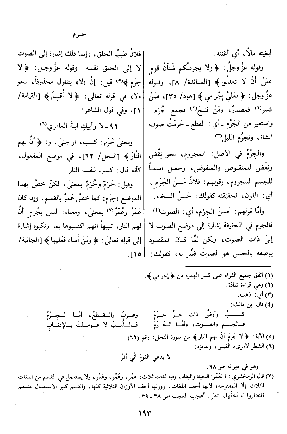 (7) قال الزمخشري: العمر: الحياة والبقاء، وفيه لغات ثلاث: عمر، وعمر، وعمر، ولا يستعمل في القسم من اللغات الثلاث إلا المفتوحة، لأنها أخف اللغات، ووزنها أخف الأوزان الثلاثية كلها، والقسم كثير الاستعمال عندهم فاختاروا له أخفّها، انظر: أعجب العجب ص 38- 39.