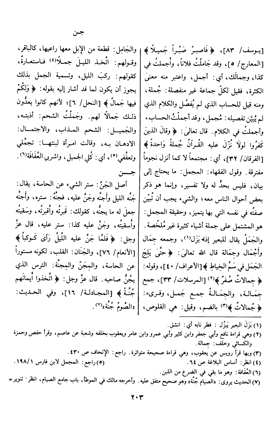 جمالات «3» بالضم، وقيل: هي القلوص، والجَامِل: قطعة من الإبل معها راعيها، كالباقر، وقولهم: اتّخذ الليل جملا «4» فاستعارة، كقولهم: ركب الليل، وتسمية الجمل بذلك يجوز أن يكون لما قد أشار إليه بقوله: وَلَكُمْ فِيها جَمالٌ [النحل/ 6] ، لأنهم كانوا يعدّون ذلك جمالا لهم. وجَمَلْتُ الشحم: أذبته، والجَمِيل: الشحم المذاب، والاجتمال: