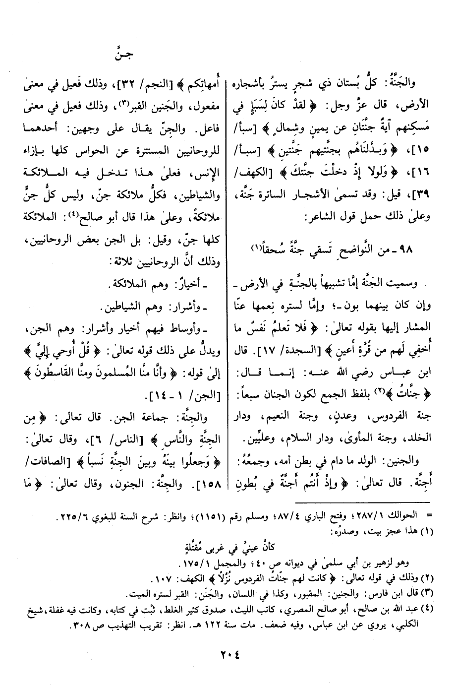 والجَنَّةُ: كلّ بستان ذي شجر يستر بأشجاره الأرض، قال عزّ وجل: لَقَدْ كانَ لِسَبَإٍ فِي مَسْكَنِهِمْ آيَةٌ جَنَّتانِ عَنْ يَمِينٍ وَشِمالٍ [سبأ/ 15] ، وَبَدَّلْناهُمْ بِجَنَّتَيْهِمْ جَنَّتَيْنِ [سبأ/ 16] ، وَلَوْلا إِذْ دَخَلْتَ جَنَّتَكَ [الكهف/ 39] ، قيل: وقد تسمى الأشجار الساترة جَنَّة، وعلى ذلك حمل قول الشاعر: