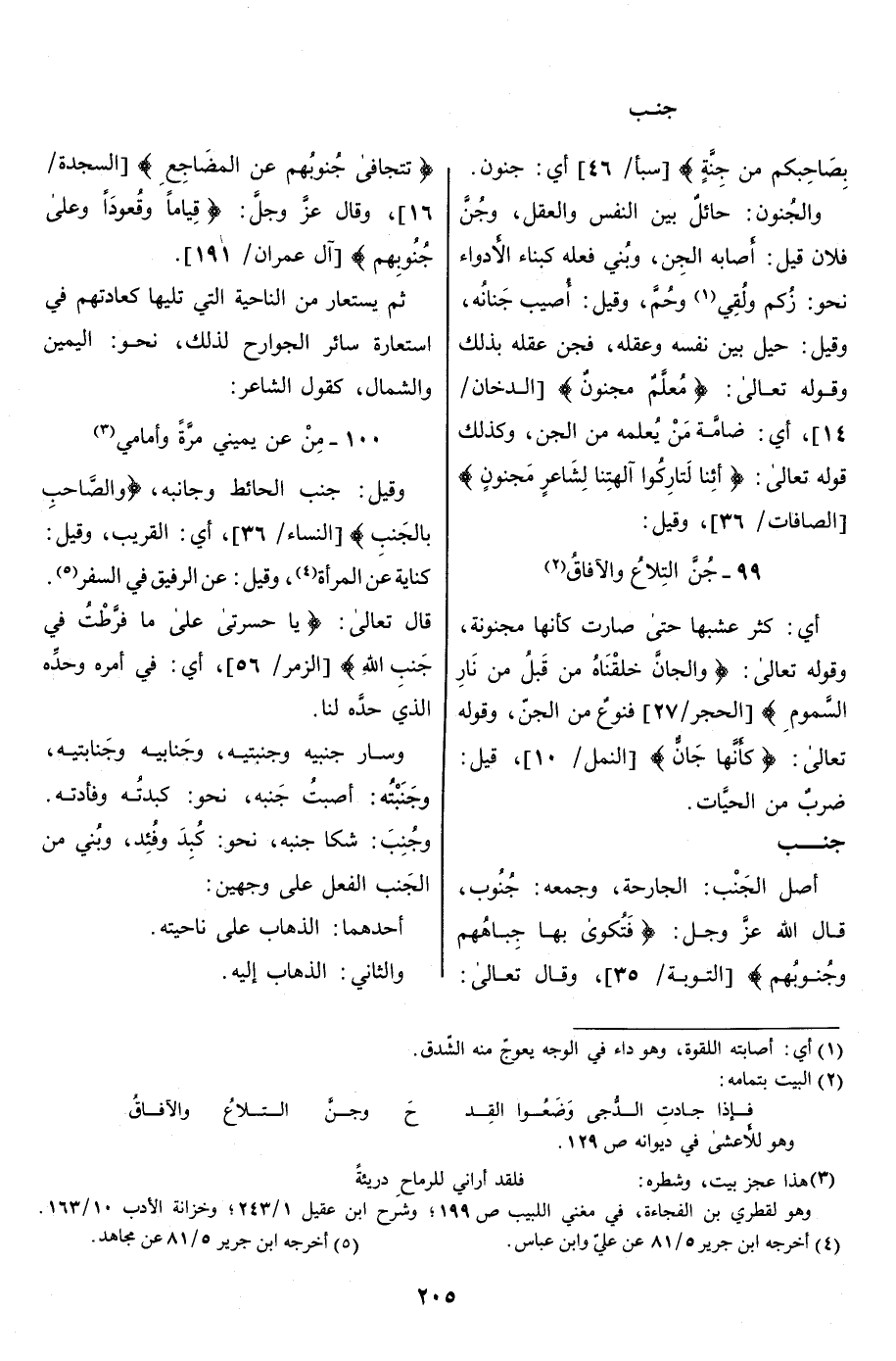 أصل الجَنْب: الجارحة، وجمعه: جُنُوب، قال الله عزّ وجل: فَتُكْوى بِها جِباهُهُمْ وَجُنُوبُهُمْ [التوبة/ 35] ، وقال تعالى: تَتَجافى جُنُوبُهُمْ عَنِ الْمَضاجِعِ [السجدة/ 16] ، وقال عزّ وجلّ: قِياماً وَقُعُوداً وَعَلى جُنُوبِهِمْ [آل عمران/ 191] .