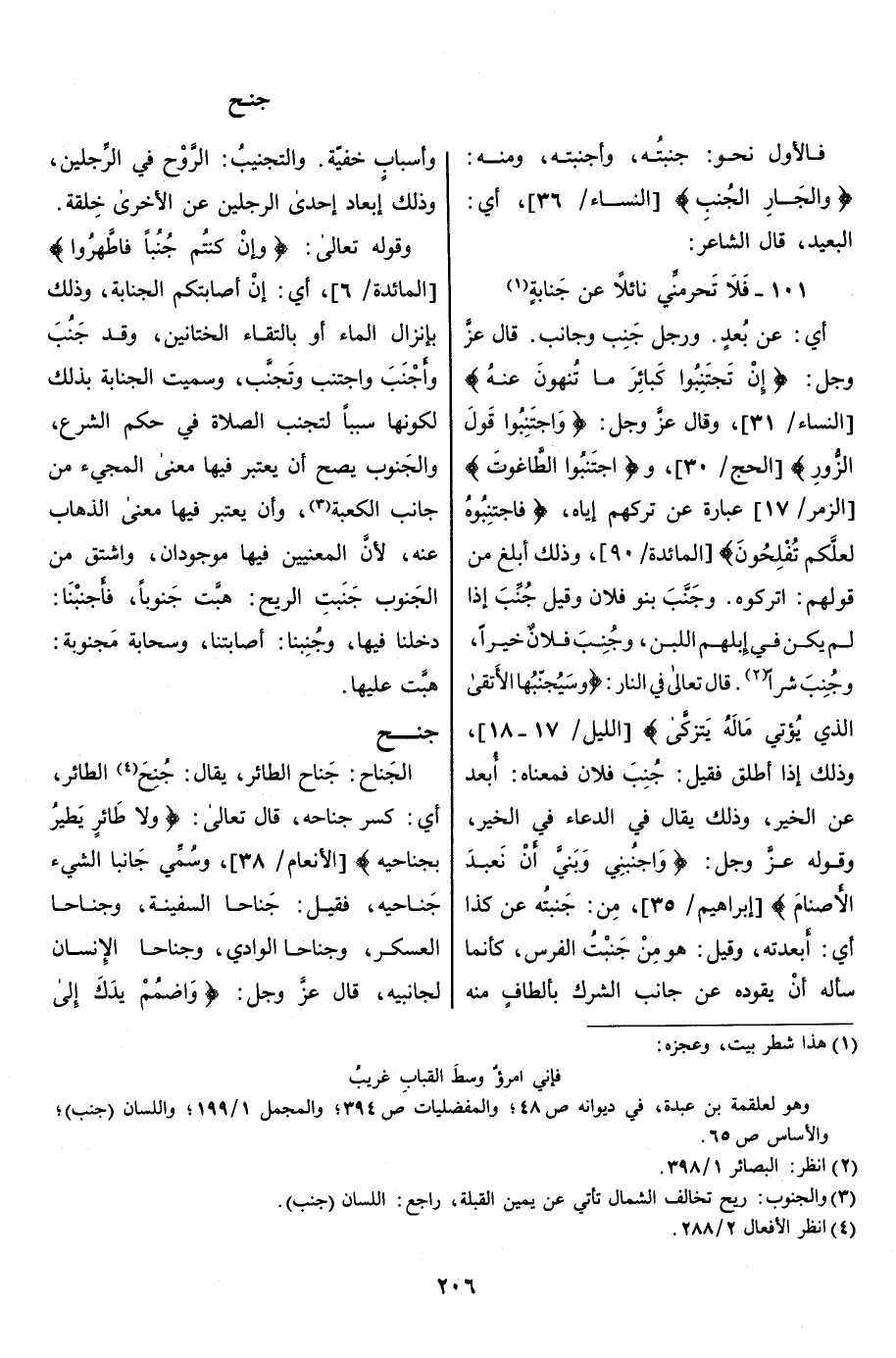[المائدة/ 6] ، أي: إن أصابتكم الجنابة، وذلك بإنزال الماء أو بالتقاء الختانين، وقد جَنُبَ وأَجْنَبَ واجْتَنَبَ وتَجَنَّبَ، وسميت الجنابة بذلك لكونها سببا لتجنب الصلاة في حكم الشرع، والجَنُوب يصح أن يعتبر فيها معنى المجيء من جانب الكعبة «3» ، وأن يعتبر فيها معنى الذهاب عنه، لأنّ المعنيين فيها موجودان، واشتق من الجنوب جَنَبَتِ الريحُ: هبّت جنوبا، فَأَجْنَبْنَا: