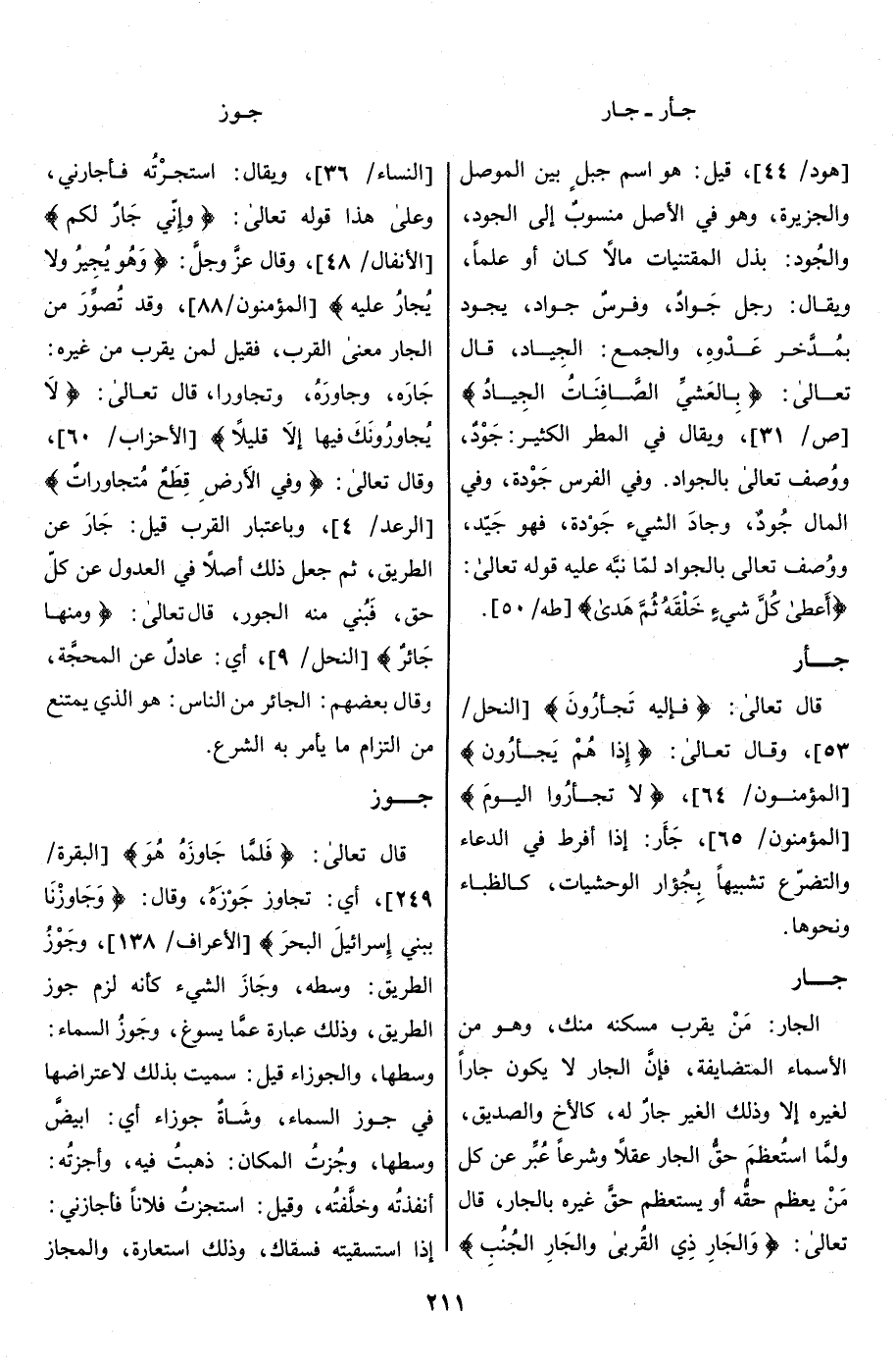 جَارَهُ، وجَاوَرَه، وتَجَاوَرَ، قال تعالى: لا يُجاوِرُونَكَ فِيها إِلَّا قَلِيلًا [الأحزاب/ 60] ، وقال تعالى: وَفِي الْأَرْضِ قِطَعٌ مُتَجاوِراتٌ [الرعد/ 4] ، وباعتبار القرب قيل: جار عن الطريق، ثم جعل ذلك أصلا في العدول عن كلّ حق، فبني منه الجور، قال تعالى: وَمِنْها جائِرٌ