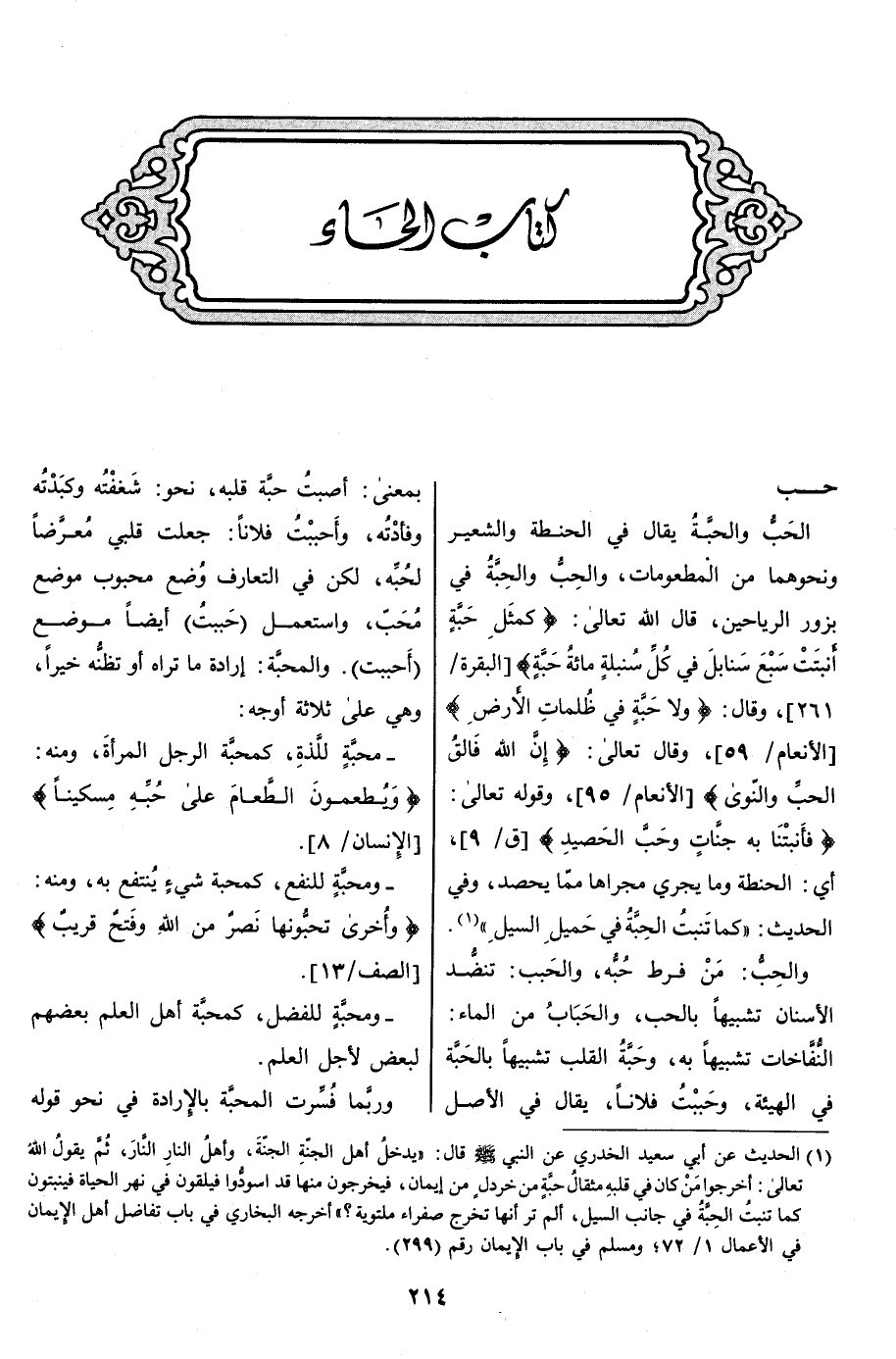 النّفّاخات تشبيها به، وحَبَّة القلب تشبيها بالحبّة في الهيئة، وحَبَبْتُ فلانا، يقال في الأصل بمعنى: أصبت حبّة قلبه، نحو: شغفته وكبدته وفأدته، وأَحْبَبْتُ فلانا: جعلت قلبي معرّضا لحبّه، لكن في التعارف وضع محبوب موضع محبّ، واستعمل (حببت) أيضا موضع (أحببت) . والمحبَّة: إرادة ما تراه أو تظنّه خيرا، وهي على ثلاثة أوجه: