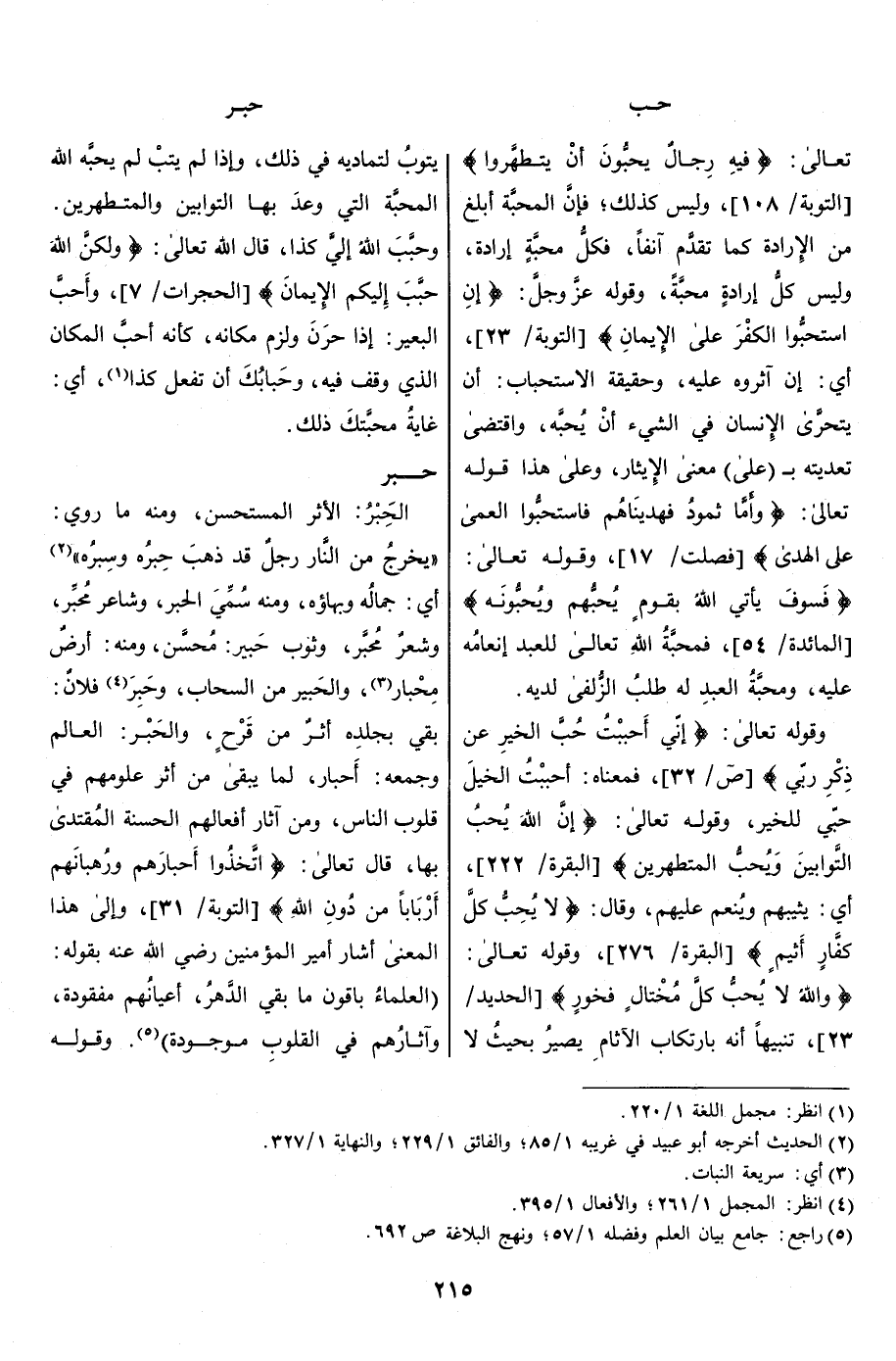 تعالى: فِيهِ رِجالٌ يُحِبُّونَ أَنْ يَتَطَهَّرُوا [التوبة/ 108] ، وليس كذلك، فإنّ المحبّة أبلغ من الإرادة كما تقدّم آنفا، فكلّ محبّة إرادة، وليس كلّ إرادة محبّة، وقوله عزّ وجلّ: إِنِ اسْتَحَبُّوا الْكُفْرَ عَلَى الْإِيمانِ [التوبة/ 23] ، أي: إن آثروه عليه، وحقيقة الاستحباب: أن يتحرّى الإنسان في الشيء أن يحبّه، واقتضى تعديته ب (على) معنى الإيثار، وعلى هذا قوله تعالى: وَأَمَّا ثَمُودُ فَهَدَيْناهُمْ فَاسْتَحَبُّوا الْعَمى عَلَى الْهُدى [فصلت/ 17] ، وقوله تعالى: