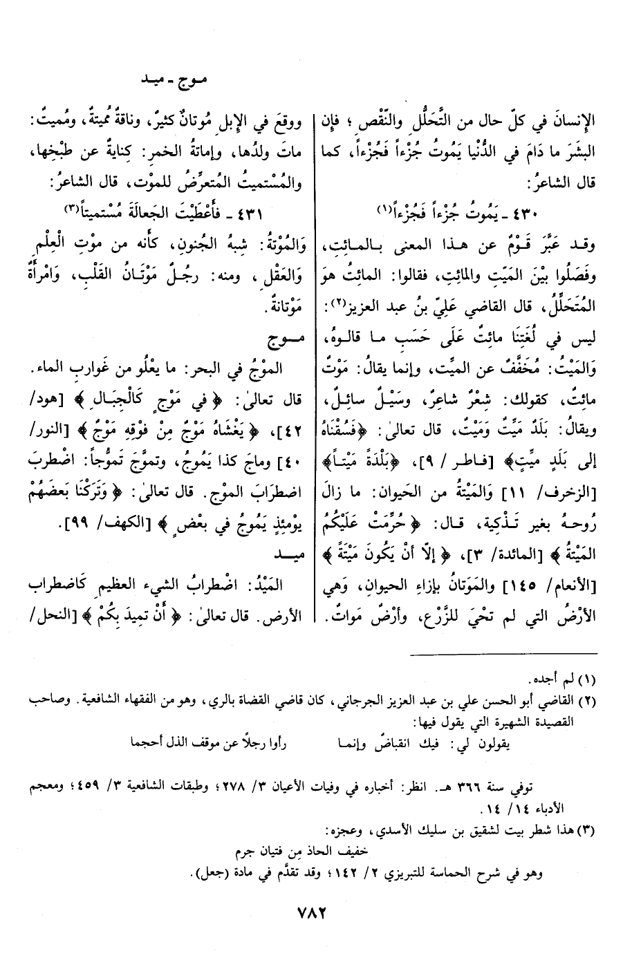 «1» وقد عَبَّرَ قوم عن هذا المعنى بِالْمَائِتِ، وفصلوا بين الميّت والمائت، فقالوا: المائت هو المتحلّل، قال القاضي عليّ بن عبد العزيز «2» :