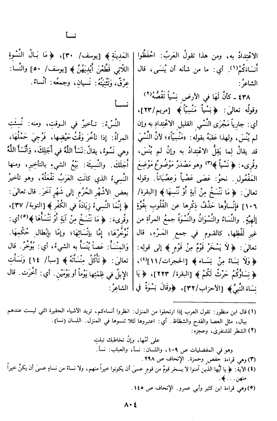 (1) قال ابن منظور: تقول العرب إذا ارتحلوا من المنزل: انظروا أنساءكم، تريد الأشياء الحقيرة التي ليست عندهم ببال، مثل العصا والقدح والشظاظ. أي: اعتبروها لئلا تنسوها في المنزل. اللسان (نسا) .