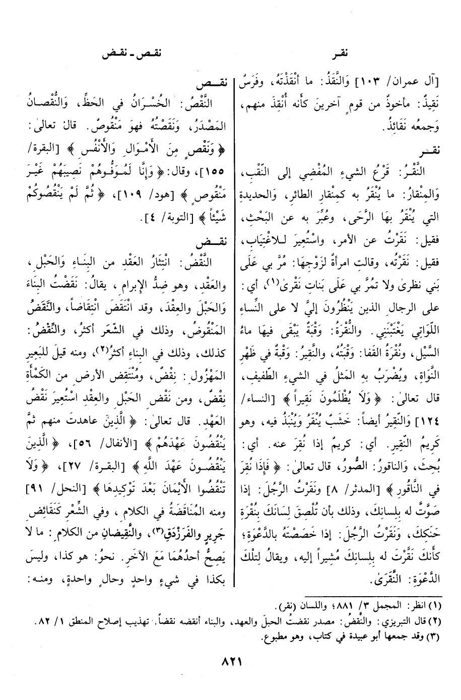 (2) قال التبريزي: والنّقض: مصدر نقضت الحبل والعهد، والبناء أنقضه نقضا. تهذيب إصلاح المنطق 1/ 82.