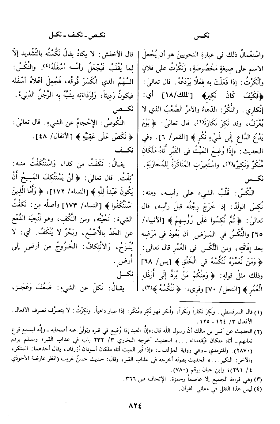 [النساء/ 173] وأصله من: نَكَفْتُ الشيْءَ: نَحَّيْتُهُ، ومن النَّكْفِ، وهو تَنْحِيَةُ الدَّمْعِ عن الخَدِّ بِالإِصْبَعِ، وبَحْرٌ لا يُنْكَفُ. أي: لا يُنْزَحُ، والانْتِكَافُ: الخُرُوجُ مِنْ أَرْضٍ إِلَى أَرْضٍ.