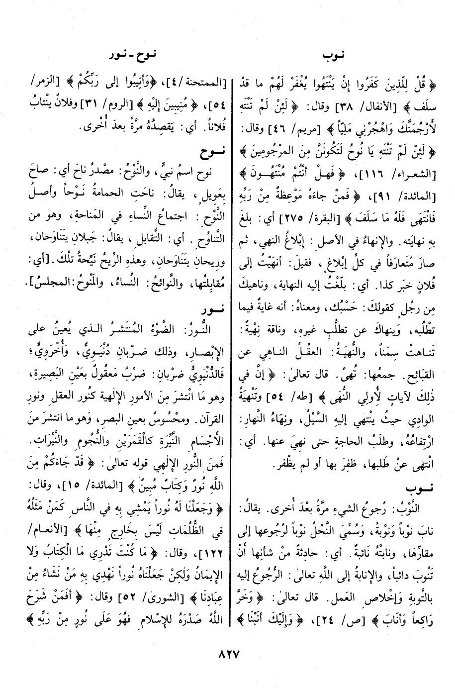 النّور: الضّوء المنتشر الذي يعين على الإبصار، وذلك ضربان دنيويّ، وأخرويّ، فالدّنيويّ ضربان: ضرب معقول بعين البصيرة، وهو ما انتشر من الأمور الإلهية كنور العقل ونور القرآن. ومحسوس بعين البصر، وهو ما انتشر من الأجسام النّيّرة كالقمرين والنّجوم والنّيّرات.