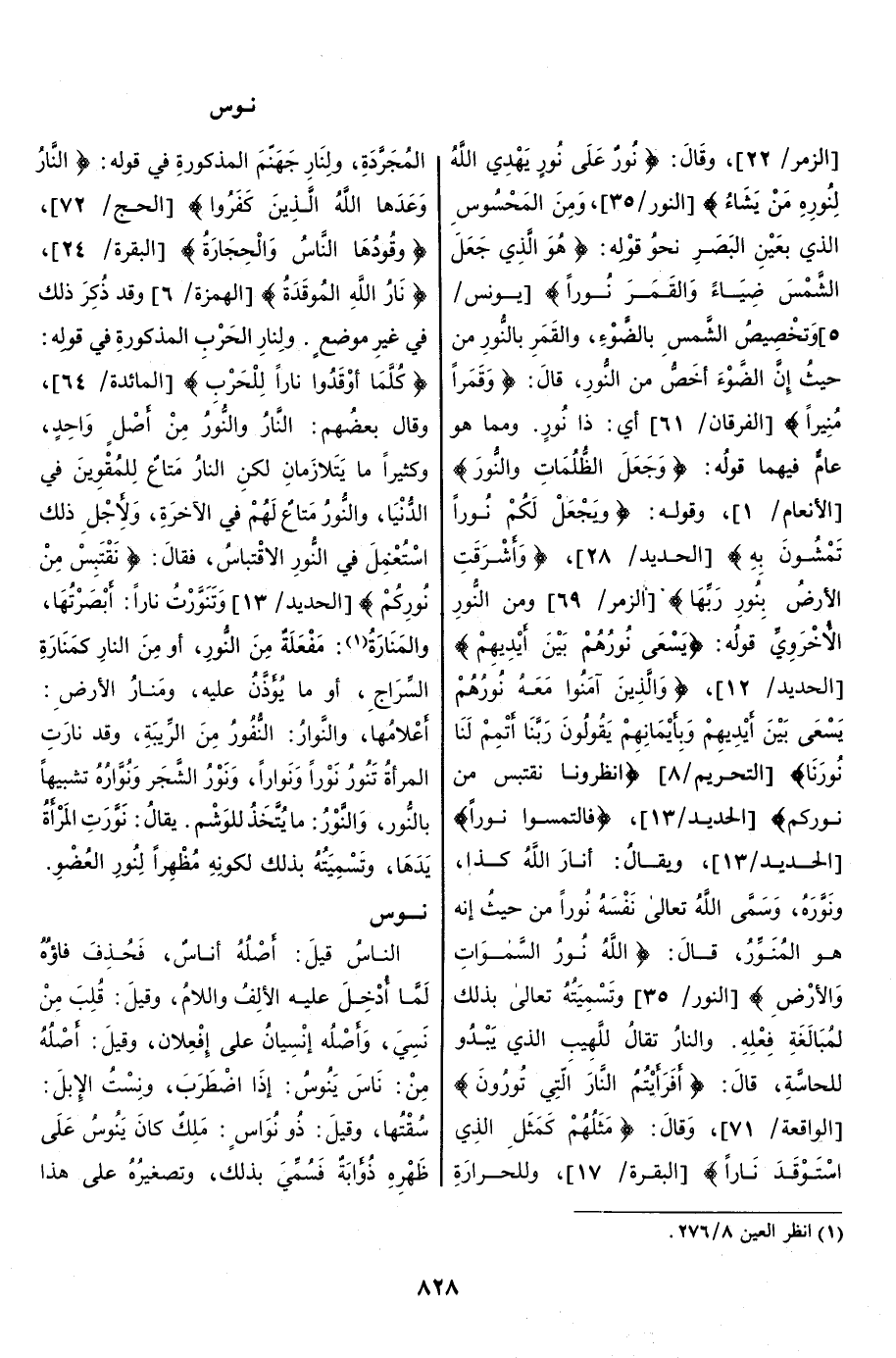 [الفرقان/ 61] أي: ذا نور. ومما هو عامّ فيهما قوله: وَجَعَلَ الظُّلُماتِ وَالنُّورَ [الأنعام/ 1] ، وقوله: وَيَجْعَلْ لَكُمْ نُوراً تَمْشُونَ بِهِ [الحديد/ 28] ، وَأَشْرَقَتِ الْأَرْضُ بِنُورِ رَبِّها [الزمر/ 69] ومن النّور الأخرويّ قوله: يَسْعى نُورُهُمْ بَيْنَ أَيْدِيهِمْ [الحديد/ 12] ، وَالَّذِينَ آمَنُوا مَعَهُ نُورُهُمْ يَسْعى بَيْنَ أَيْدِيهِمْ وَبِأَيْمانِهِمْ يَقُولُونَ رَبَّنا أَتْمِمْ لَنا نُورَنا [التحريم/ 8] انْظُرُونا نَقْتَبِسْ مِنْ نُورِكُمْ [الحديد/ 13] ، فَالْتَمِسُوا نُوراً [الحديد/ 13] ، ويقال: أنار الله كذا، ونَوَّرَه، وسمّى الله تعالى نفسه نورا من حيث إنه هو المُنَوِّر، قال: اللَّهُ نُورُ السَّماواتِ وَالْأَرْضِ [النور/ 35] وتسميته تعالى بذلك لمبالغة فعله. والنَّارُ تقال للهيب الذي يبدو للحاسّة، قال: أَفَرَأَيْتُمُ النَّارَ الَّتِي تُورُونَ [الواقعة/ 71] ، وقال: مَثَلُهُمْ كَمَثَلِ الَّذِي اسْتَوْقَدَ ناراً [البقرة/ 17] ، وللحرارة المجرّدة، ولنار جهنّم المذكورة في قوله: النَّارُ وَعَدَهَا اللَّهُ الَّذِينَ كَفَرُوا [الحج/ 72] ، وَقُودُهَا النَّاسُ وَالْحِجارَةُ [البقرة/ 24] ، نارُ اللَّهِ الْمُوقَدَةُ [الهمزة/ 6] وقد ذكر ذلك في غير موضع. ولنار الحرب المذكورة في قوله: