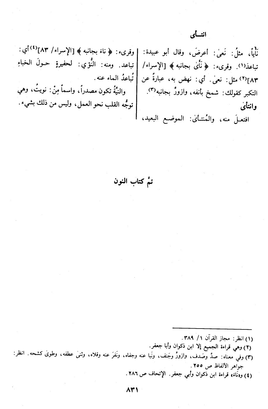 وانتأى افتعل منه، والمنتأى: الموضع البعيد، وقرئ: ناء بجانبه [الإسراء/ 83] «4» أي:
