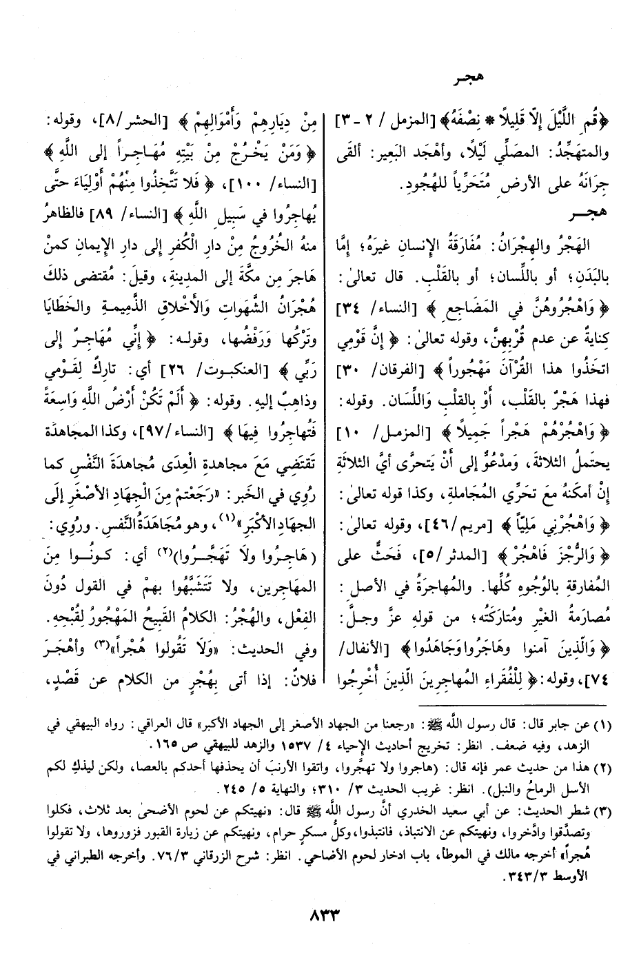 وَمَنْ يَخْرُجْ مِنْ بَيْتِهِ مُهاجِراً إِلَى اللَّهِ [النساء/ 100] ، فَلا تَتَّخِذُوا مِنْهُمْ أَوْلِياءَ حَتَّى يُهاجِرُوا فِي سَبِيلِ اللَّهِ [النساء/ 89] فالظاهر منه الخروج من دار الكفر إلى دار الإيمان كمن هاجر من مكّة إلى المدينة، وقيل: مقتضى ذلك هجران الشّهوات والأخلاق الذّميمة والخطايا وتركها ورفضها، وقوله: إِنِّي مُهاجِرٌ إِلى رَبِّي [العنكبوت/ 26] أي: تارك لقومي وذاهب إليه. وقوله: أَلَمْ تَكُنْ أَرْضُ اللَّهِ واسِعَةً فَتُهاجِرُوا فِيها [النساء/ 97] ، وكذا المجاهدة تقتضي مع العدى مجاهدة النّفس كما روي في الخبر: «رجعتم من الجهاد الأصغر إلى الجهاد الأكبر» «1» ، وهو مجاهدة النّفس. وروي: