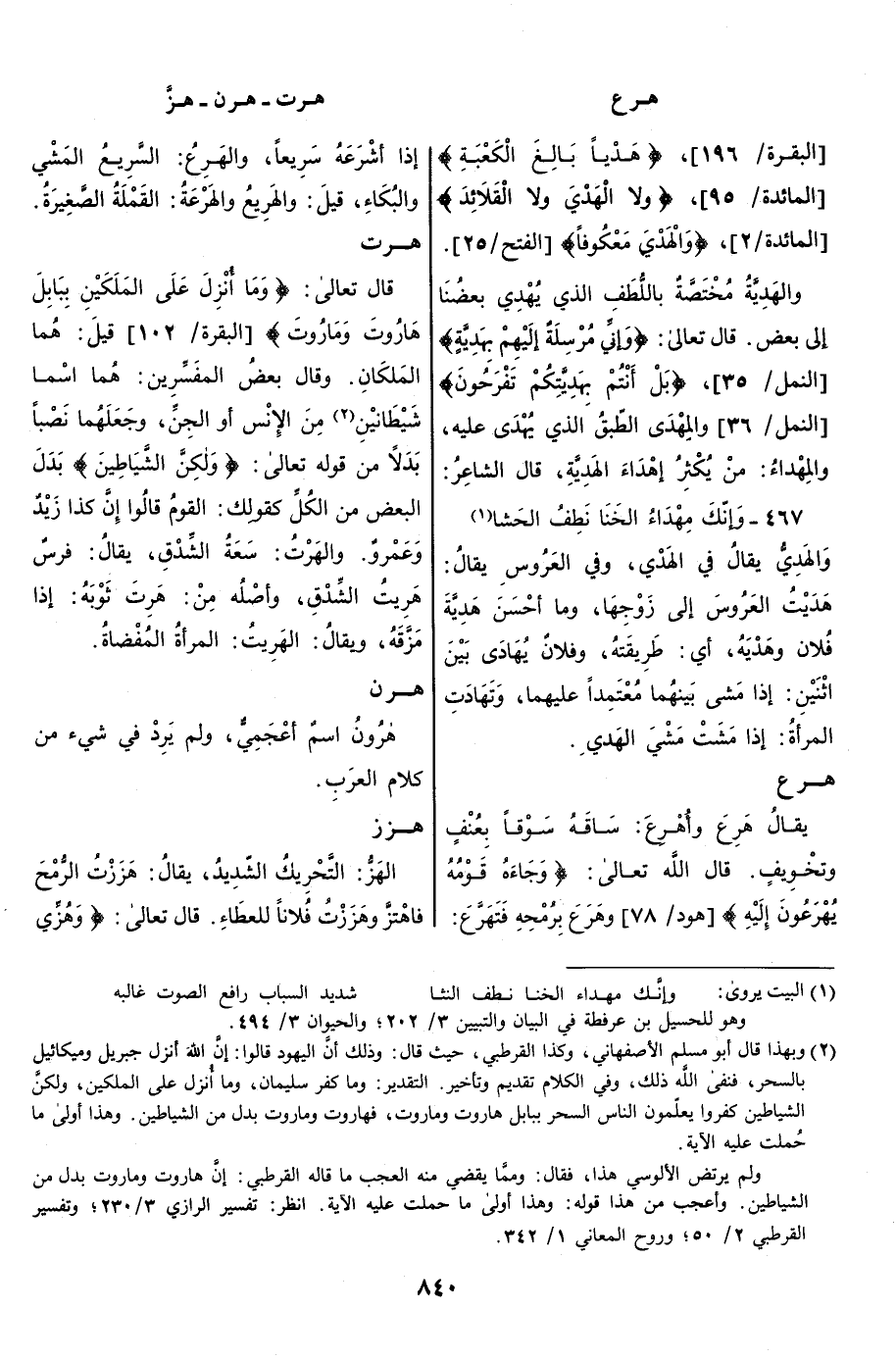 [البقرة/ 102] قيل: هما الملكان. وقال بعض المفسّرين: هما اسما شيطانين «2» من الإنس أو الجنّ، وجعلهما نصبا بدلا من قوله تعالى: وَلكِنَّ الشَّياطِينَ بدل البعض من الكلّ كقولك: القوم قالوا إنّ كذا زيد وعمرو. والْهَرْتُ: سعة الشِّدْق، يقال: فرس هَرِيتُ الشِّدْق، وأصله من: هَرِتَ ثوبه: إذا مزّقه، ويقال: الْهَرِيتُ: المرأة المفضاة.