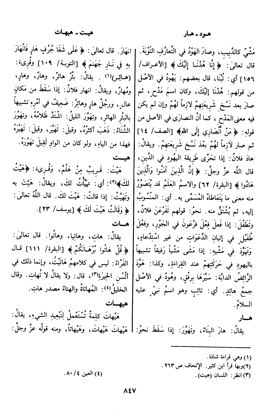 قُلْ هاتُوا بُرْهانَكُمْ [البقرة/ 111] قال الفرّاء: ليس في كلامهم هاتيت، وإنما ذلك في ألسن الحيرة «3» ، قال: ولا يقال لا تهات. وقال الخليل «4» : المُهَاتَاةُ والهتاءُ مصدر هات.