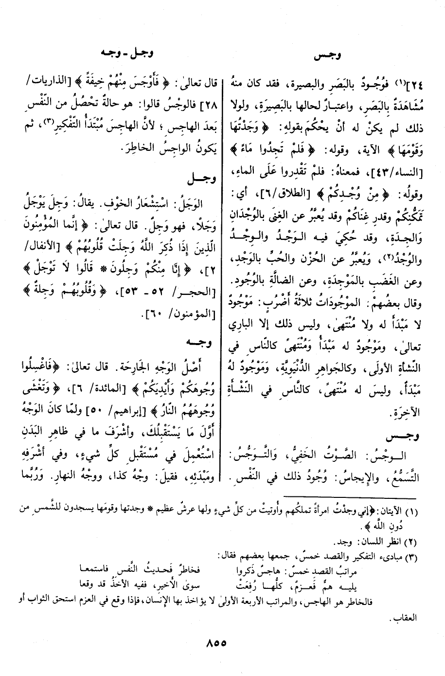 [الذاريات/ 28] فالوَجْس قالوا: هو حالة تحصل من النّفس بعد الهاجس، لأنّ الهاجس مبتدأ التّفكير «3» ، ثم يكون الواجس الخاطر.