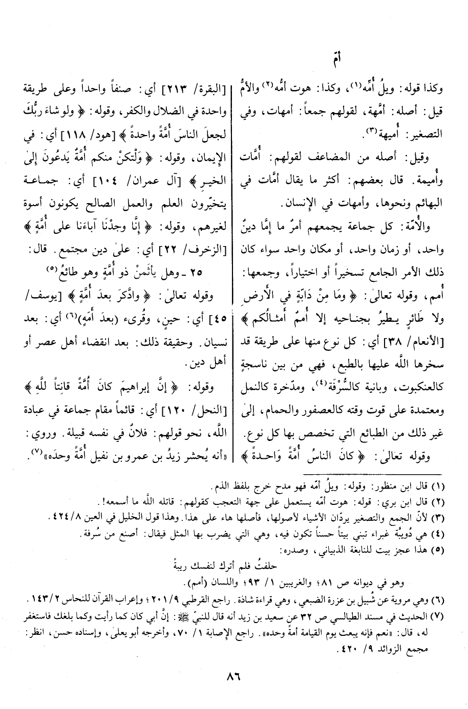 وقوله تعالى: كانَ النَّاسُ أُمَّةً واحِدَةً [البقرة/ 213] أي: صنفا واحدا وعلى طريقة واحدة في الضلال والكفر، وقوله: وَلَوْ شاءَ رَبُّكَ لَجَعَلَ النَّاسَ أُمَّةً واحِدَةً [هود/ 118] أي: في الإيمان، وقوله: وَلْتَكُنْ مِنْكُمْ أُمَّةٌ يَدْعُونَ إِلَى الْخَيْرِ [آل عمران/ 104] أي: جماعة يتخيّرون العلم والعمل الصالح يكونون أسوة لغيرهم، وقوله: إِنَّا وَجَدْنا آباءَنا عَلى أُمَّةٍ [الزخرف/ 22] أي: على دين مجتمع. قال:
