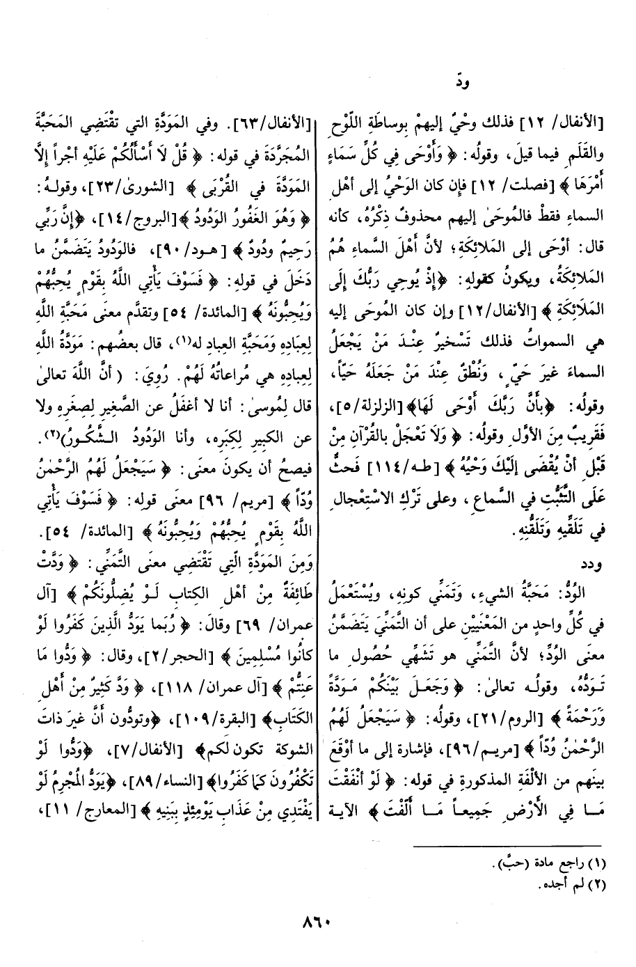 [مريم/ 96] ، فإشارة إلى ما أوقع بينهم من الألفة المذكورة في قوله: لَوْ أَنْفَقْتَ ما فِي الْأَرْضِ جَمِيعاً ما أَلَّفْتَ الآية [الأنفال/ 63] . وفي المودّة التي تقتضي المحبّة المجرّدة في قوله: قُلْ لا أَسْئَلُكُمْ عَلَيْهِ أَجْراً إِلَّا الْمَوَدَّةَ فِي الْقُرْبى [الشورى/ 23] ، وقوله: