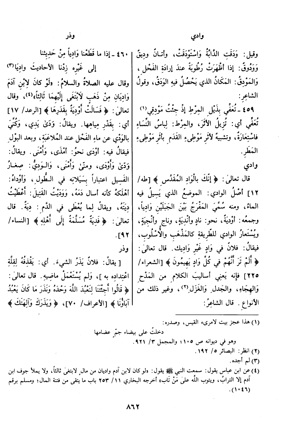 [طه/ 12] أصل الوَادِي: الموضع الذي يسيل فيه الماء، ومنه سُمِّيَ المَفْرَجُ بين الجبلين وَادِياً، وجمعه: أَوْدِيَةٌ، نحو: ناد وأندية، وناج وأنجية، ويستعار الوَادِي للطّريقة كالمذهب والأسلوب، فيقال: فلان في وَادٍ غير وَادِيكَ. قال تعالى: