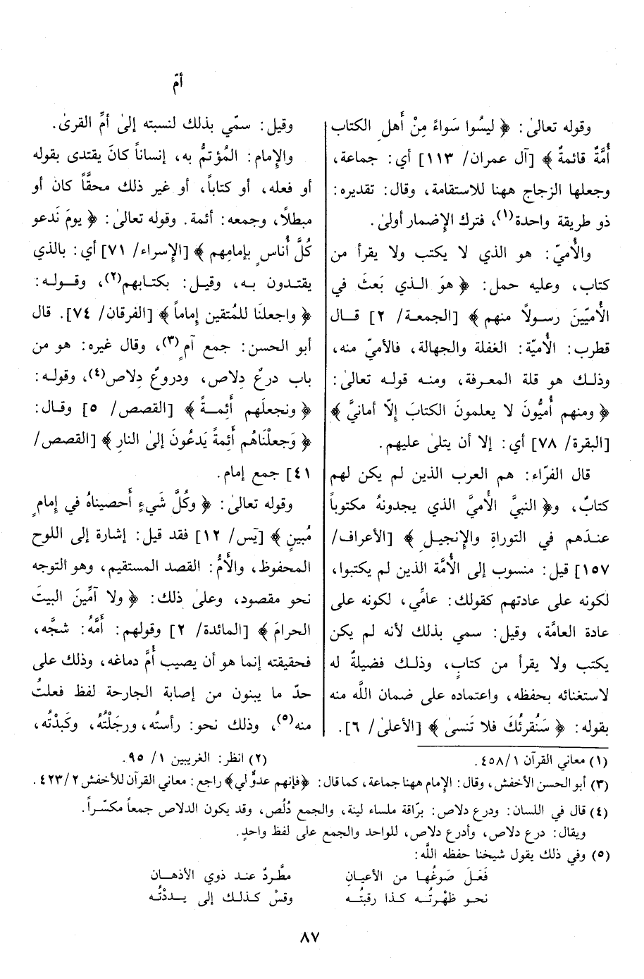 قال الفرّاء: هم العرب الذين لم يكن لهم كتاب، والنَّبِيَّ الْأُمِّيَّ الَّذِي يَجِدُونَهُ مَكْتُوباً عِنْدَهُمْ فِي التَّوْراةِ وَالْإِنْجِيلِ [الأعراف/ 157] قيل: منسوب إلى الأمّة الذين لم يكتبوا، لكونه على عادتهم كقولك: عامّي، لكونه على عادة العامّة، وقيل: سمي بذلك لأنه لم يكن يكتب ولا يقرأ من كتاب، وذلك فضيلة له لاستغنائه بحفظه، واعتماده على ضمان الله منه بقوله: سَنُقْرِئُكَ فَلا تَنْسى [الأعلى/ 6] . وقيل: سمّي بذلك لنسبته إلى أمّ القرى.