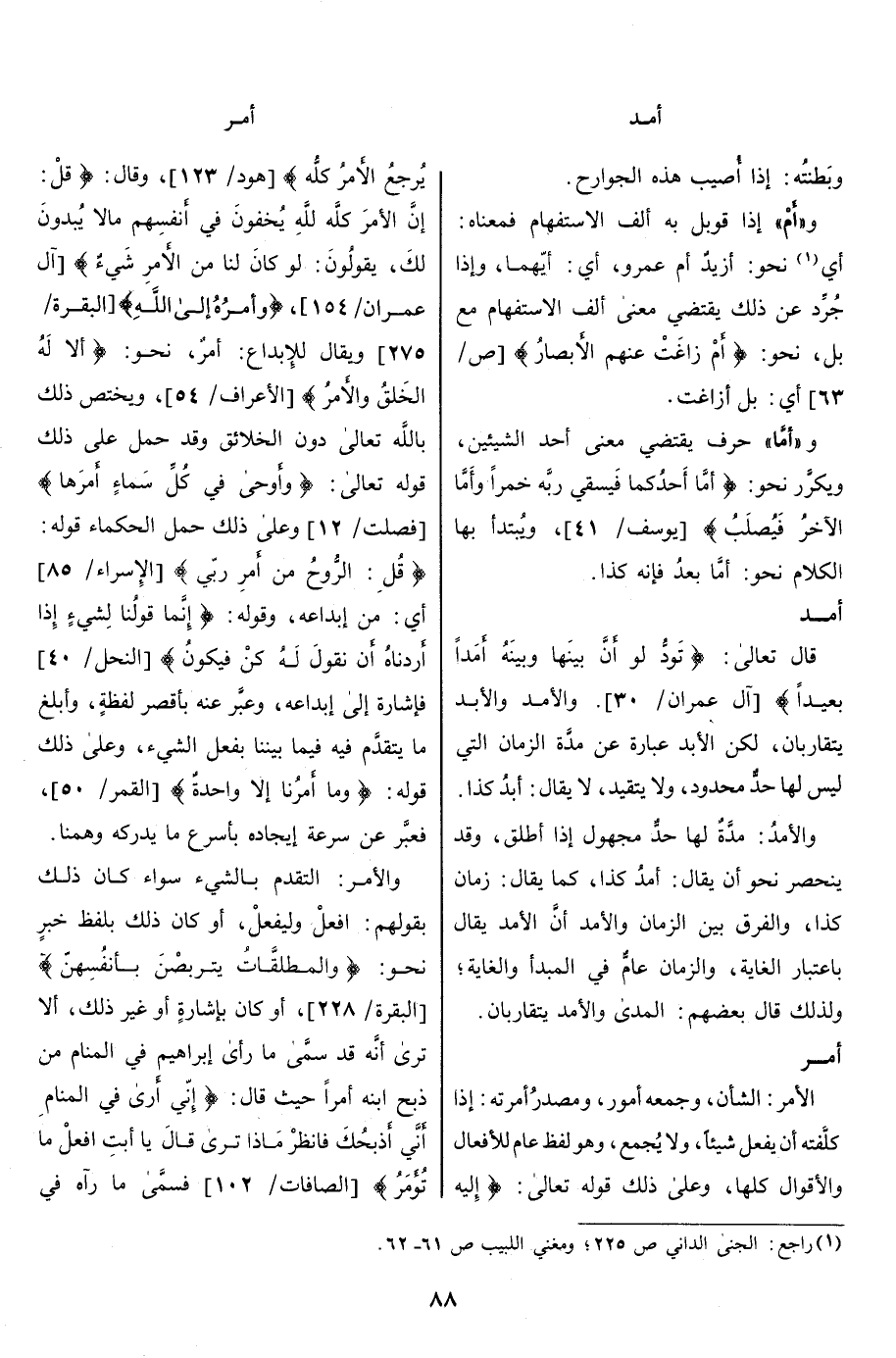 قال تعالى: تَوَدُّ لَوْ أَنَّ بَيْنَها وَبَيْنَهُ أَمَداً بَعِيداً [آل عمران/ 30] . والأَمَد والأبد يتقاربان، لكن الأبد عبارة عن مدّة الزمان التي ليس لها حدّ محدود، ولا يتقيد، لا يقال: أبد كذا.